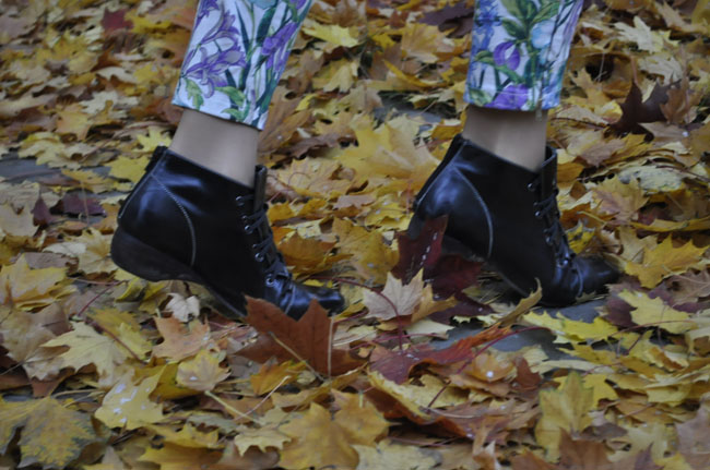 Spodnie z motywem kwiatowym połączyłam tym razem z wzorzystą bluzką utrzymaną w podobnej kolorystyce. Kurtka, która stała się ostatnio jedną z moich ulubionych. Pasuje do wielu stylizacji i jest swoistym przełamaniem kolorów. Wyróżniaja się tu również bordowy szal, który jest niewiarygodnie mięciutki i przyjemny. Do łask powróciły także moje smukłe botki sprzed kilku sezonów.