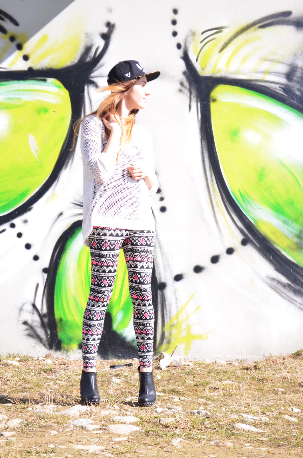 Mieszanie wzorów, to nie jest łatwy temat. Bardzo łatwo można przesadzić i mieć za dużo wszystkiego. Dlatego do wzorzystych leginsów dobrałam sweterek w jednym kolorze, również we wzory. Całość dopełniłam butami z ćwiekami i czapką. Mam nadzieję, że podoba wam się taki zestaw ;)
