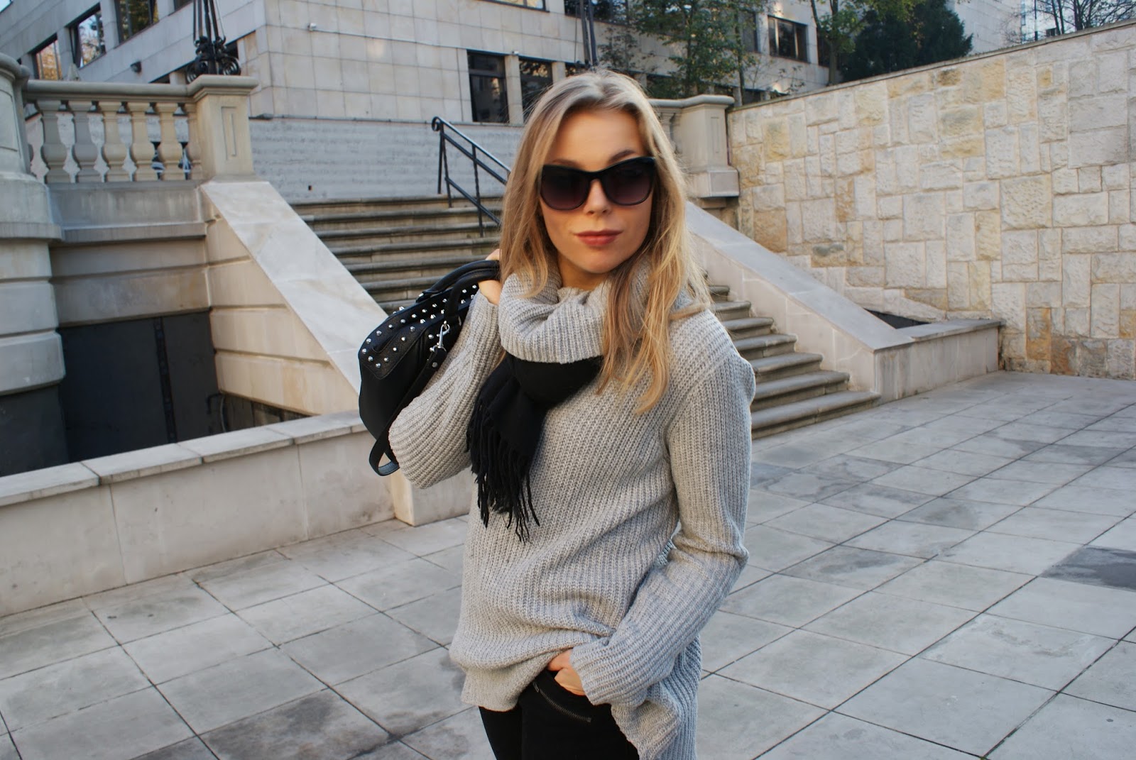 Szary długi sweter mogliście już oglądać w którymś z ubiegłych postów, czarne dopasowane spodnie, granatowe sztyblety i czarne dłuższe futerko (właśnie takie było na mojej liście jesiennych życzeń). Czarna torebka ze srebrnymi ćwiekami staje się pożytecznym dodatkiem, kiedy muszę schować do niej wszystkie rzeczy potrzebne na cały dzień pracy.