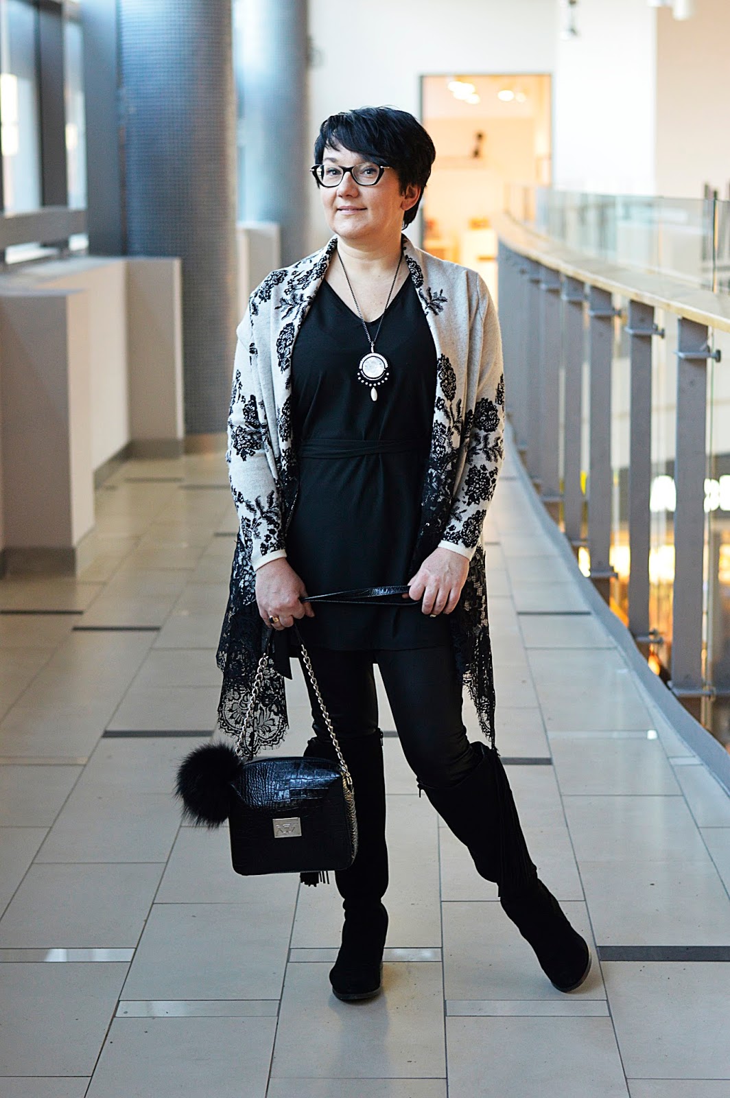 KARDIGAN - BUTIK / TUNIKA - F&F % / NASZYJNIK - WIOLETA / KOZAKI - MOHITO / TOREBKA - WOJAS / FOTO - JUNIOR