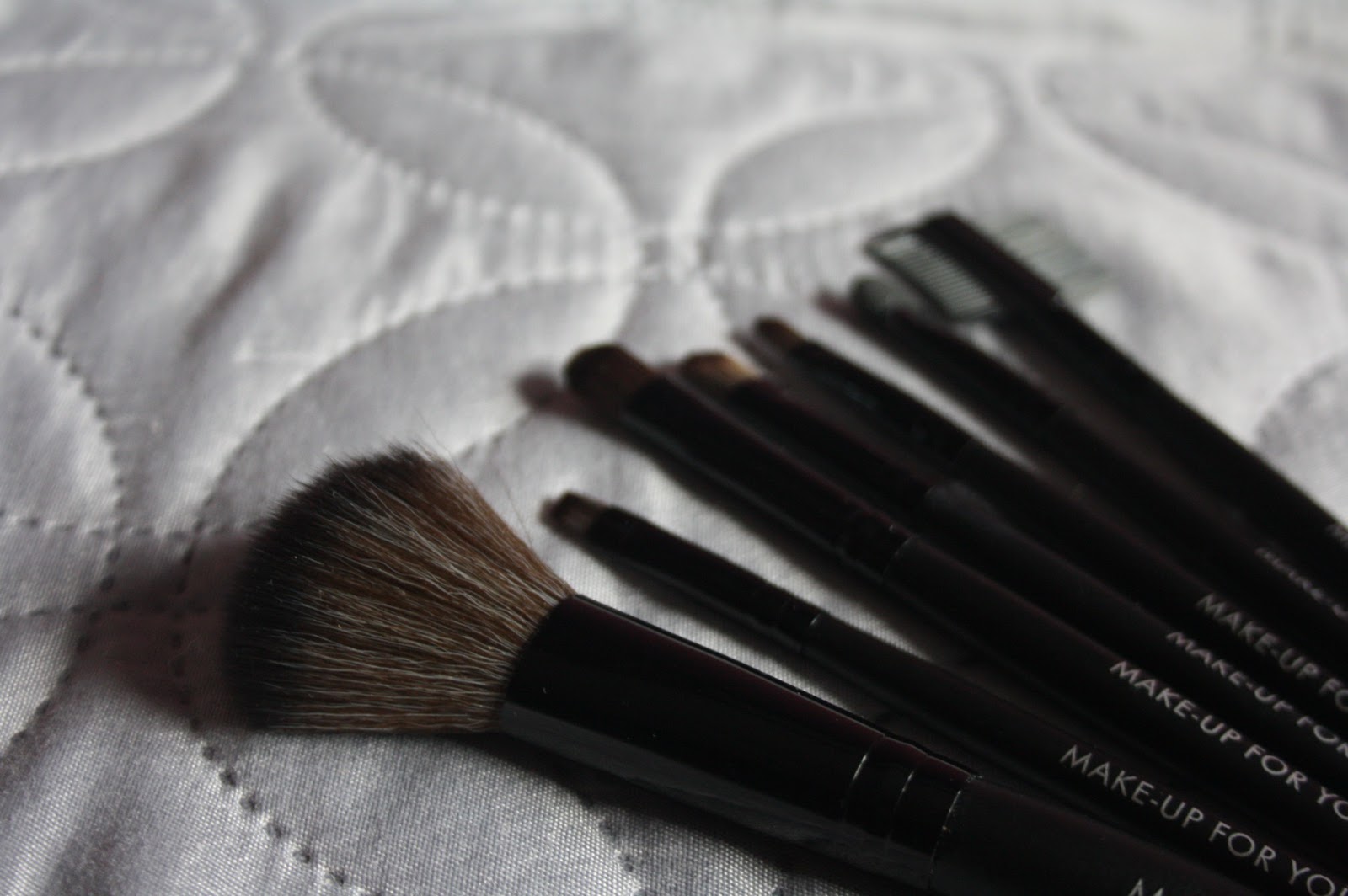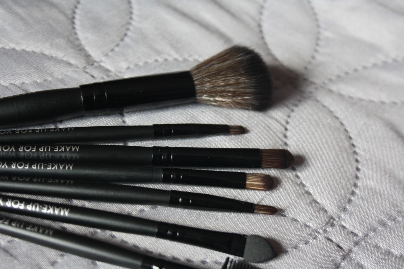 Drugą rzeczą z zamówienia są pędzle, które zamówił mój fotograf. Jest to zestaw siedmiu pędzi do makijażu, każdy przeznaczony do malowania innej partii twarzy. Między innymi: pędzel do różu, powiek, brwi, do nakładania błyszczyku lub pomadki, szczoteczkę do wyczesywania rzęs lub brwi oraz patyczek do powiek (ten z gąbeczką). Wiadomo, że za 12 zł nie należy spodziewać się jakiejś super jakości, ale pędzle są w miarę dobre i dosyć solidnie wykonane. Po przeczesaniu palcami, włosie nie wychodzi. Cały zestaw posiada materiałowe pudełeczko do przechowywania oraz jest dostępny w kilku rożnych kolorach, a Karina wybrała akurat klasyczny, czarny.