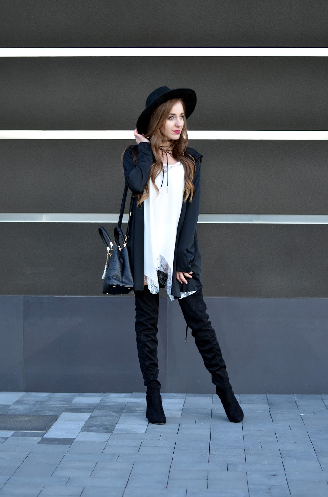 Zobacz oryginał ndz., 23/10/2016 - 20:00Witajcie:) Jak Wam minął weekend? Mój bardzo pracowicie, pogoda dopisała i przy okazji udało mi się zrobić mnóstwo zdjęć:) Czarno-białe zestawy chyba nigdy mi się nie znudzą. Moja szafa jest w tym momencie głównie czarno-biało-szaro-różowa, ale na szczęście pojawiają się w niej powoli elementy bordowe i beżowe. W dzisiejszym zestawie połączyłam zwiewną sukienkę z koronką do wysokich czarnych kozaków, dobrałam kapelusz oraz najmodniejszy naszyjnik w tym sezonie choker (a tak właściwe to dwa;) Drobne złote elementy przy kozakach czy torebce uzupełniają fajnie całość. Pod tego typu asymetryczne sukienki warto założyć białe szorty - jest dużo bezpieczniej i troszkę cieplej (oj nie mogę sobie wyobrazić jak będzie coraz chłodniej). Kochani zbliża się Halloween - fajne ciuszki i ciekawe przebrania znajdziecie TUTAJ. Zapraszam Was również na instagram tutaj oraz snapchat balaczka ;*