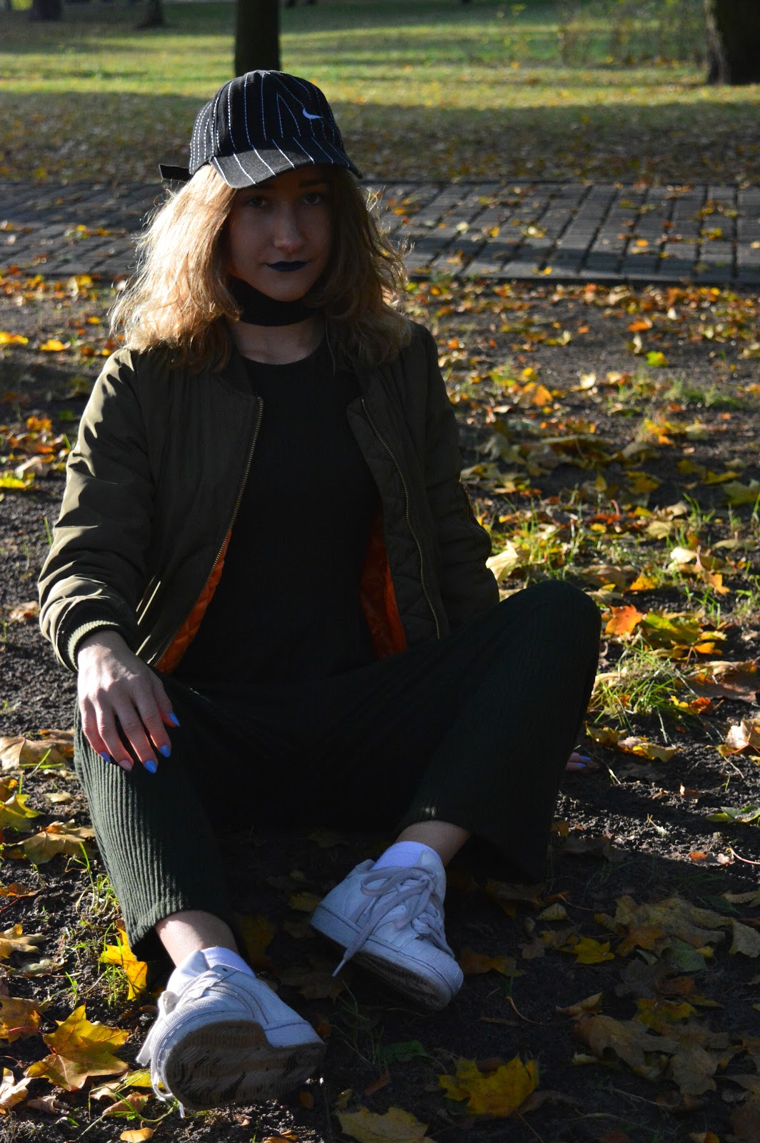 Kombinezon|Bershka.com| Kurtka bomber|Aliexpress.com| Czapka baseball|Lumpeks| Buty|Adidas SuperStar| Naszyjnik|Aliexpress.com|