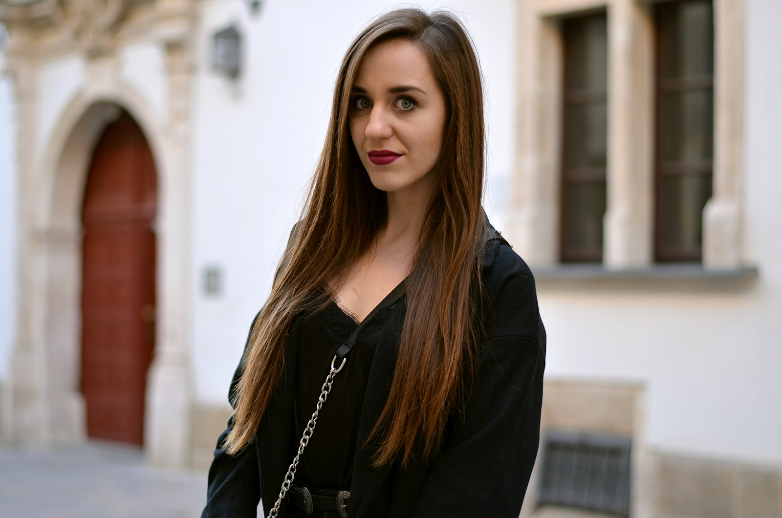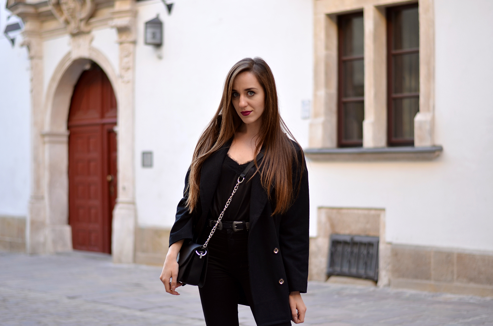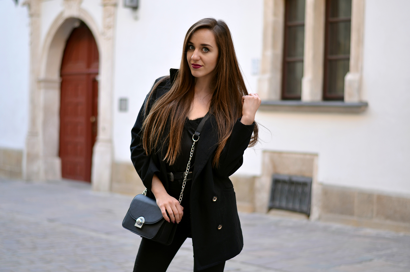 Zobacz oryginał czw., 16/03/2017 - 20:00Witajcie:) Trzecia sesja z Krakowa oraz mój kolejny black total look. Który to już z kolei? A postarałam się znaleźć moje wszystkie czarne zestawy i wyszło tego sporo. Jest to jeden z moich ulubionych kolorów i oczywiście jeden z bezpieczniejszych, w którym prawie zawsze czuje się dobrze (jedynie latem wolę dużo bardziej jasne kolory). Delikatną bluzkę ala bieliźnianą z koronką zestawiłam z modnymi spodniami z dziurami, a na to zarzuciłam ulubiony płaszcz i dodatki. Idealny zestaw na wieczorne wyjście. W wersji luźniejszej fajnie wygląda również z Adidasami Superstar (sprawdziłam Krakowski rynek zdecydowanie nie nadaje się do tego rodzaju butów, dlatego ja na wyjście wybrałam jednak opcję wygodną). Jeśli chcecie na bieżąco wiedzieć co u mnie zaglądajcie na instagram @balaczka. A poniżej podałam Wam linki do innych zestawów;)