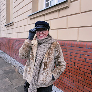 Czarny gorsetowy top, ołówkowa spódniczka, czarne rajstopy i lakierowane buty