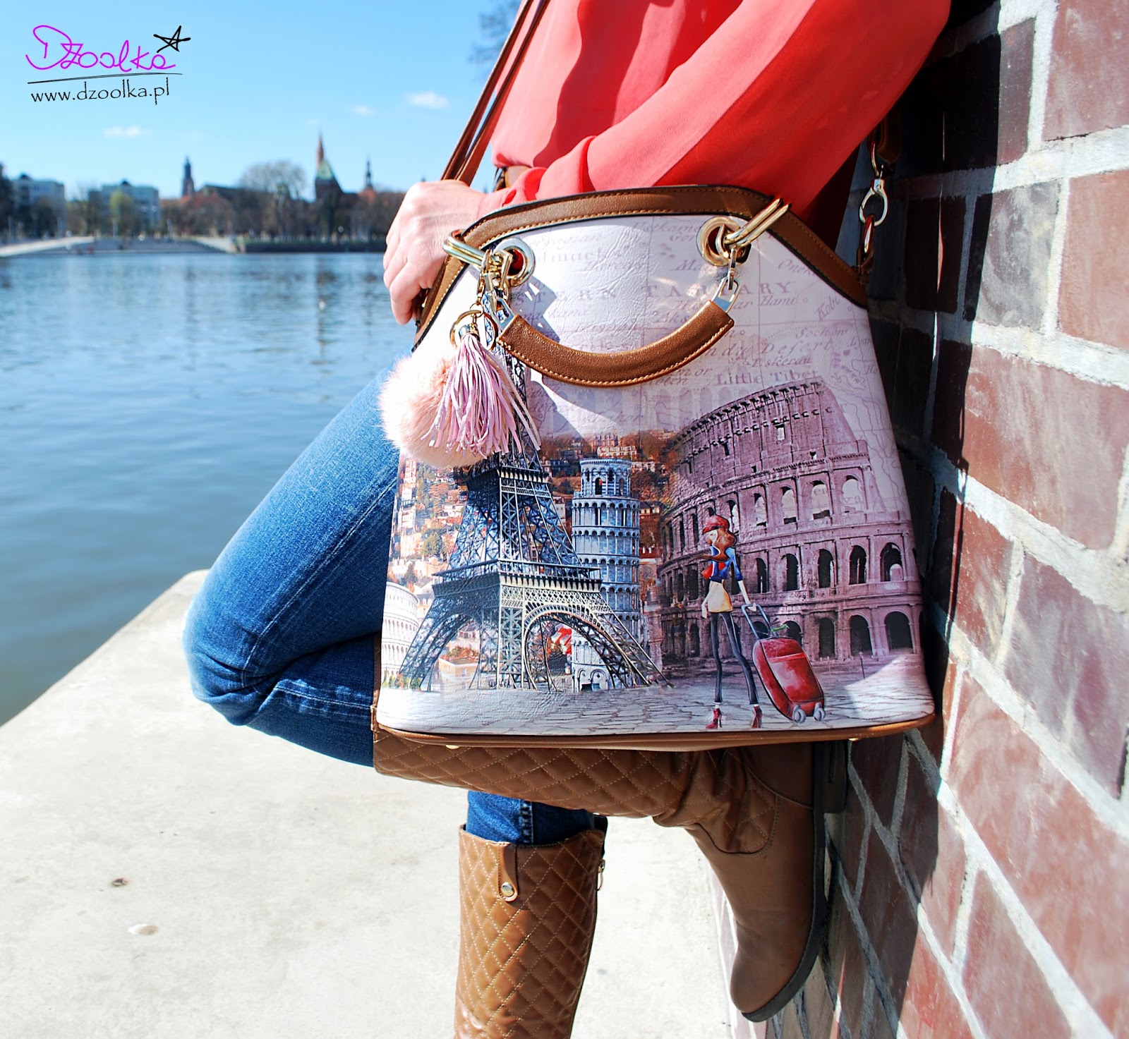 Jeśli chodzi o dodatki to, poza łańcuszkami, stanowi je tak naprawdę jedynie torebka. Jest ona na tyle wzorzysta, że nie wymaga więcej ozdób. Do torebki mam przypięty futrzany pompon.