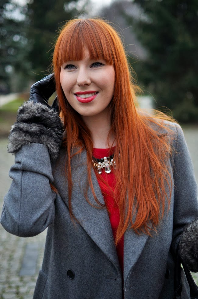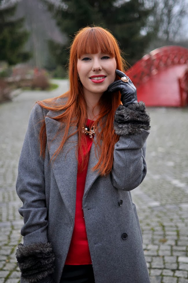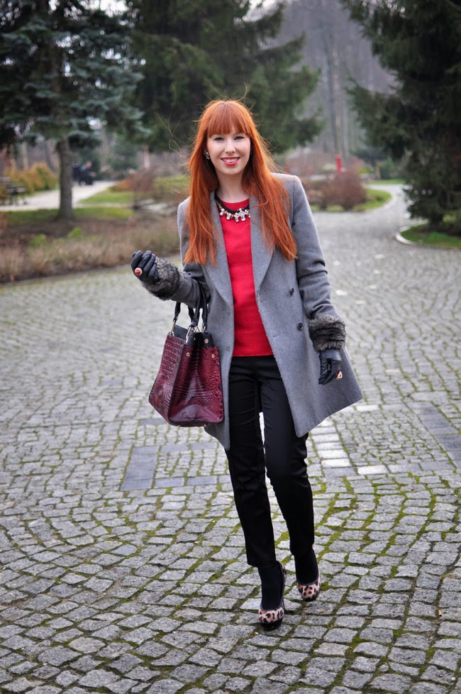 Zobacz oryginał śr., 15/01/2014 - 23:32Czerwień jest kolorem, który najbardziej kojarzy mi się ze Świętami. Uwielbiam tę barwę, głównie za to, że mimo swojej zadziorności, potrafi współgrać z klasyką. Właśnie dlatego nie wyobrażałam sobie nie wykorzystać tej pięknej bluzki w jednym ze świątecznych zestawów. Święta to czas, w którym się wyciszam, również pod względem ubioru. Część z Was zauważyła to już w poprzednim poście i odczuwaliście niedosyt kolorów. Obiecuję, że w kolejnych sesjach nie zabraknie gry kolorów i będziecie mogli znów podziwiać całą ich paletę. Póki co, jest red gray black. Połyskująca czarna tkanina spodni podkreśla wyjątkowość tej stylizacji i jest niejako opozycją do karbowanego, sztywnego materiału bluzki. Doczepiany naszyjnik, który prócz świecidełek, składa się z czarnego plecionego sznureczka, dodaje całości wyrazistości. Na wierzch zarzuciłam już tylko prosty szary płaszcz, ręce ogrzewałam pod długimi rękawicami z futerkiem, a całą masę szpargałów wrzuciłam do jakże pojemnej torby z tworzywa imitującego krokodylą skórę. Swoją drogą to ostatnio moja ulubiona torba :D