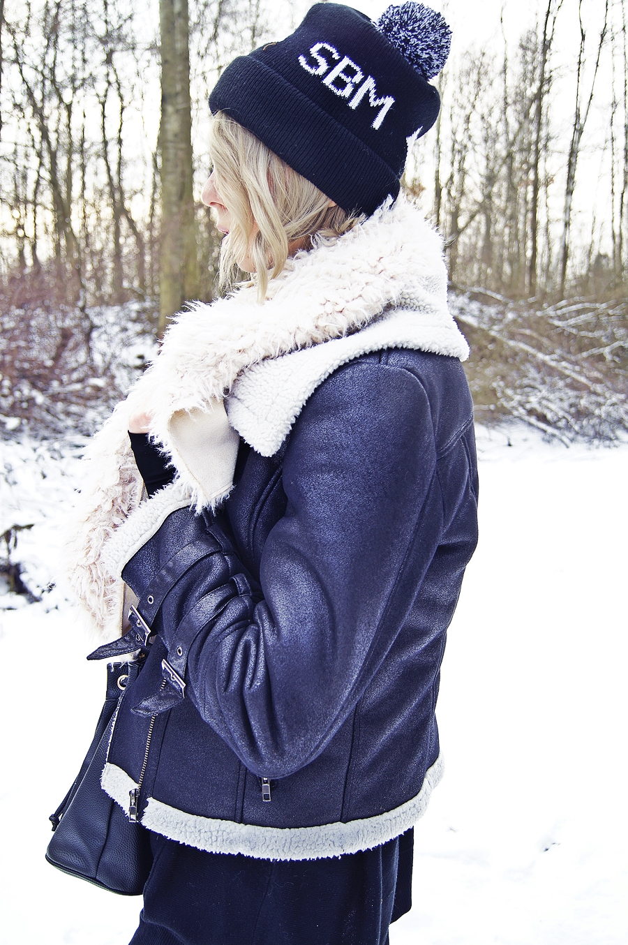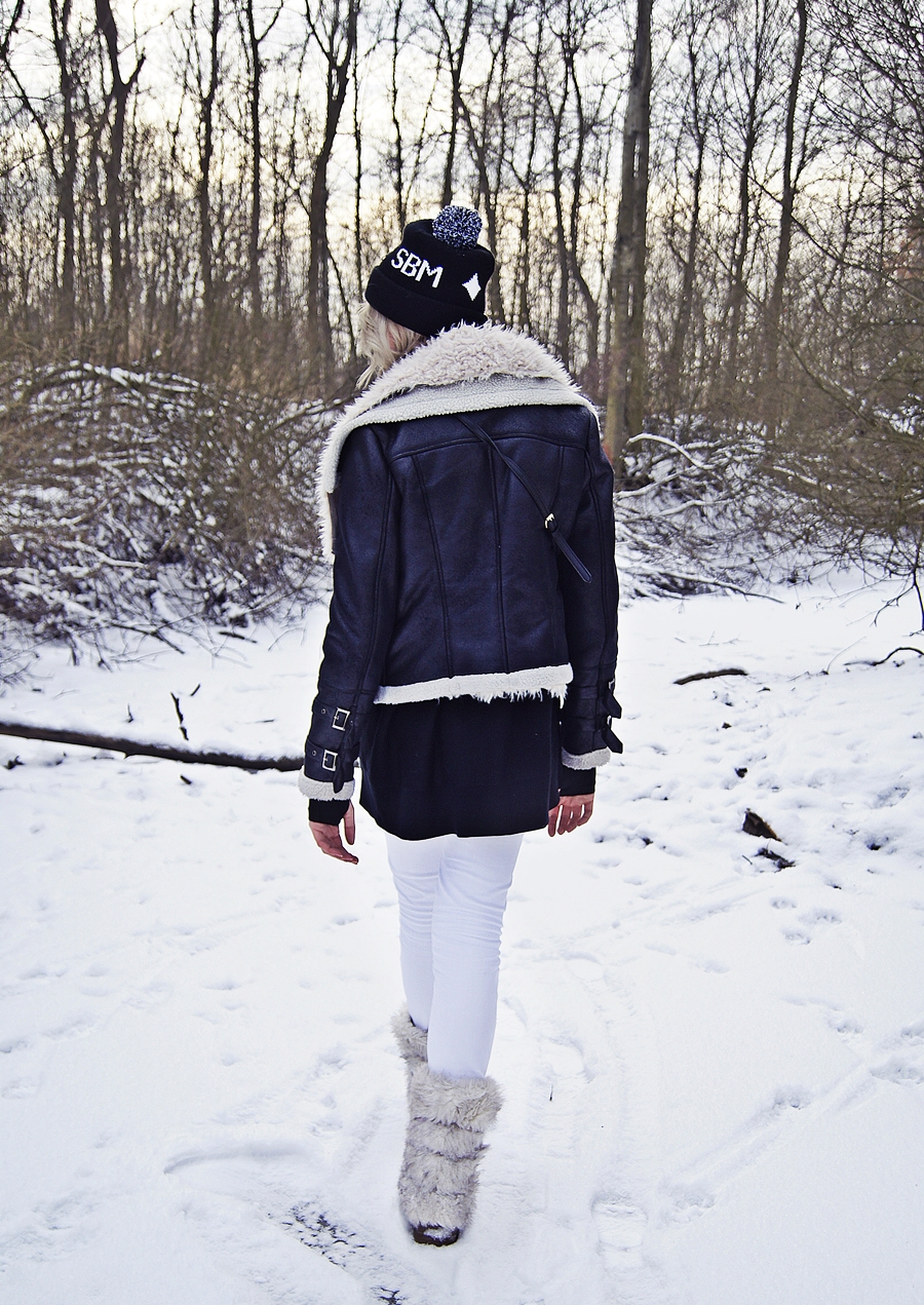 Wielkie ciepłe buty, czapka z pomponem i futrzana kamizelka.