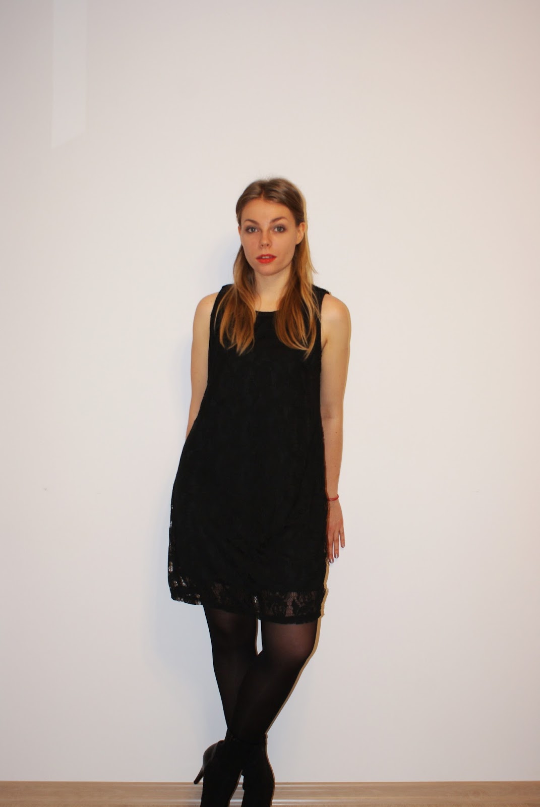 Hej kochani! Dzisiaj przychodzę do was z moją sylwestrową propozycją, w postaci czarnej koronkowej sukienki, w połączeniu z czarnymi rajstopami i botkami na szpilce wygląda bardzo elegancko. Szminka w marchewkowym kolorze i lekko spięte włosy dają całemu zestawowi lekkości. Jak się ubierzecie na tę wyjątkową noc?