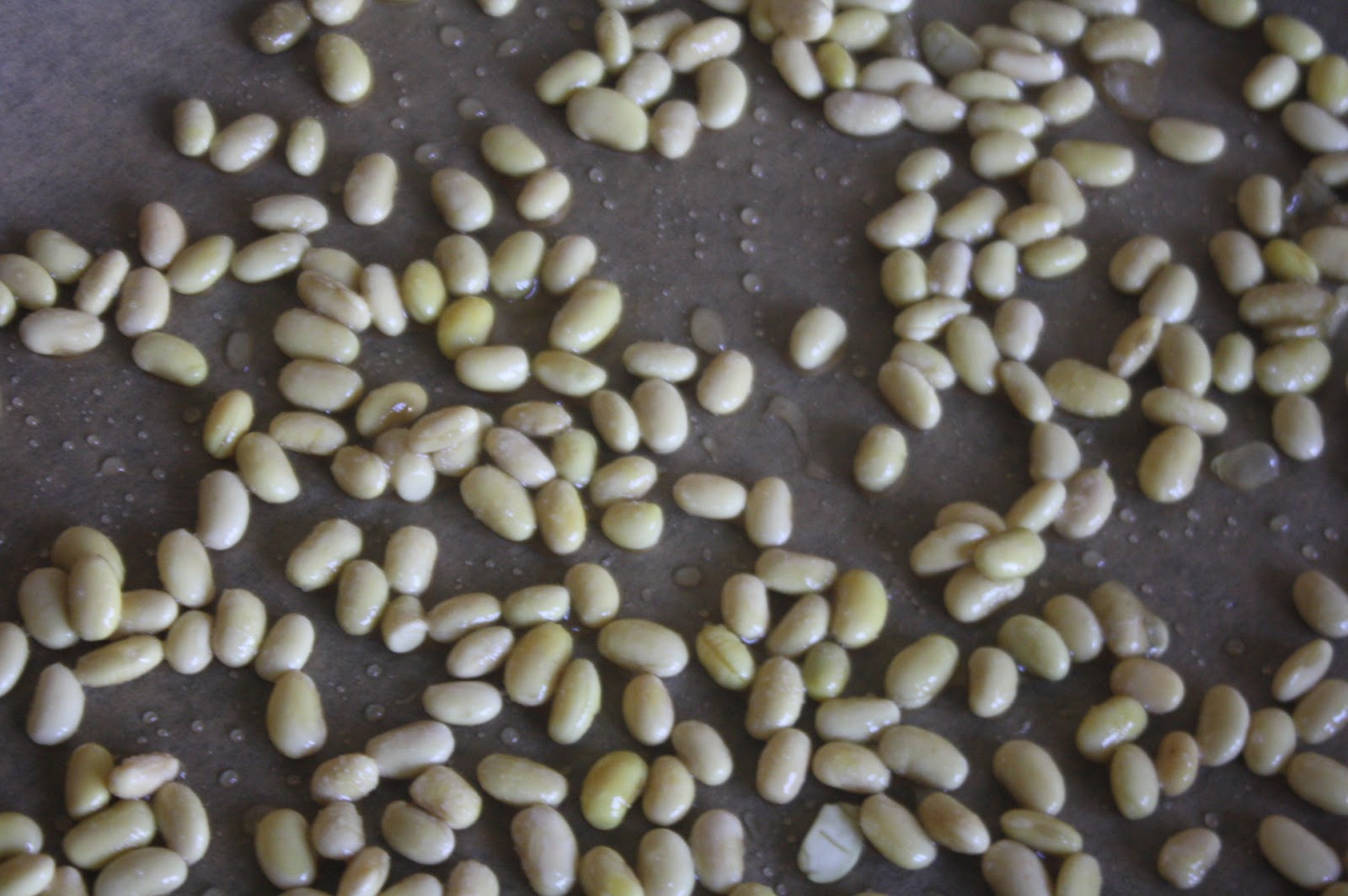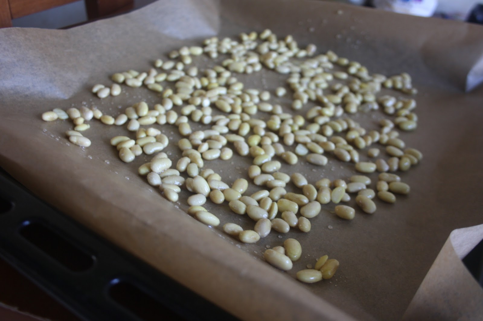 - Rozkładamy soje na papierze do pieczenia i wstawiamy do rozgrzanego do 180 stopni piekarnika, na 40 minut.