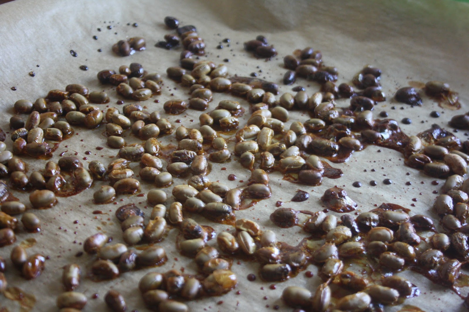 - Po tym czasie wyjmujemy nasze ziarenka i gotowe ! (jeżeli wybraliście opcję z miodem, soja będzie ciężej schodzić z papieru i będzie sprawiała wrażenie przypalonej, gdyż miód podczas pieczenia ciemnieje).