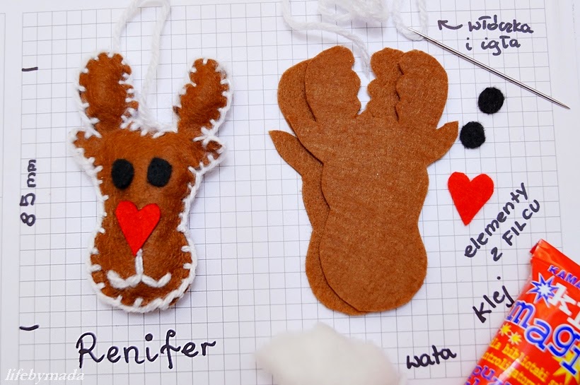 Do stworzenia zawieszek idealnie nadał się filc. Bardzo się dobrze z nim pracuje i jest szybki w obróbce. Przy każdej ozdobie najwięcej czasu zajęło mi jej obszycie. Szyłam według opisu, który wam pokazałam w poprzednim tutorialu ze świąteczną poduszką diy - zobacz TUTAJ.