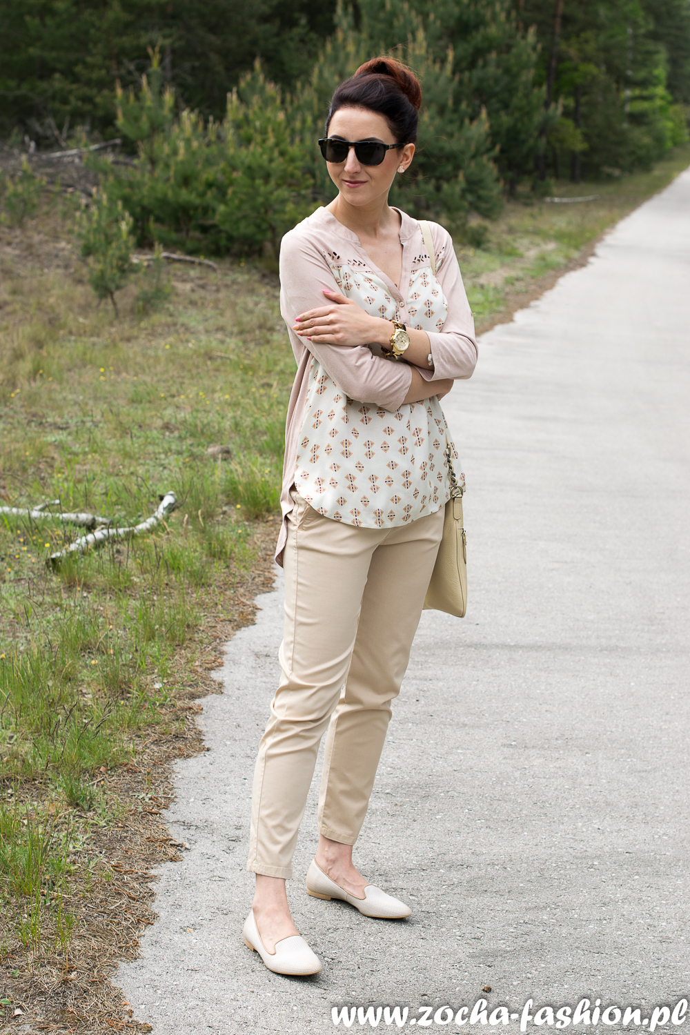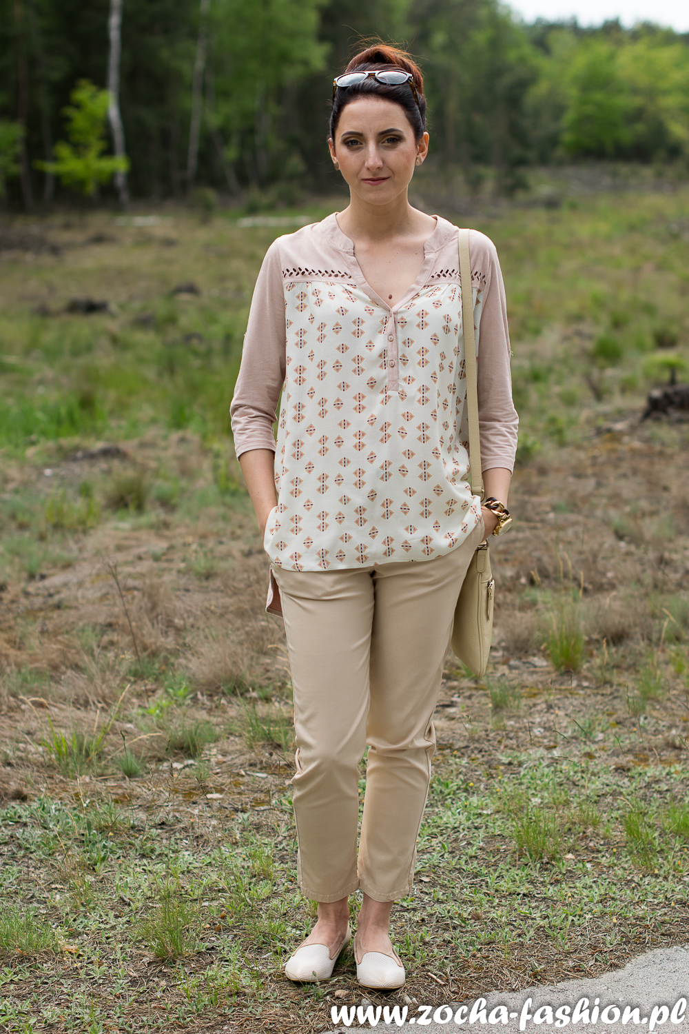 Zobacz oryginał pon., 23/05/2016 - 08:51Dziś królują pastele. Wydaje mi się, że stonowane barwy nadają subtelności kobiecie. Uwielbiam beże, pudrowe róże i kremy. W tych kolorach czuję się chyba najlepiej, jeśli chodzi o okres wiosna/lato. Ostatnimi czasy pogoda nas bardzo rozpieszcza i chyba nie przesadzę twierdząc, że w powietrzu już powoli czuć lato. Wracając do zestawu mam na sobie piękną ażurową bluzeczką w geometryczne wzory (po prostu ją uwielbiam), do tego zbliżone kolorystycznie spodnie (zakupione na promocji). Dodatki to totalny minimalizm - skórzane balerinki, torba listonosza wszystko zachowane w tonacji całości. Prosto, tak jak lubię. Podoba się Wam ta propozycja ?