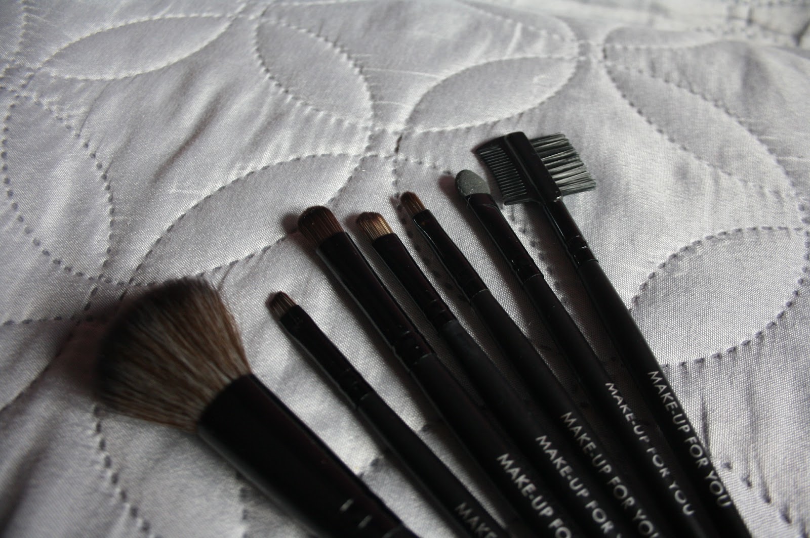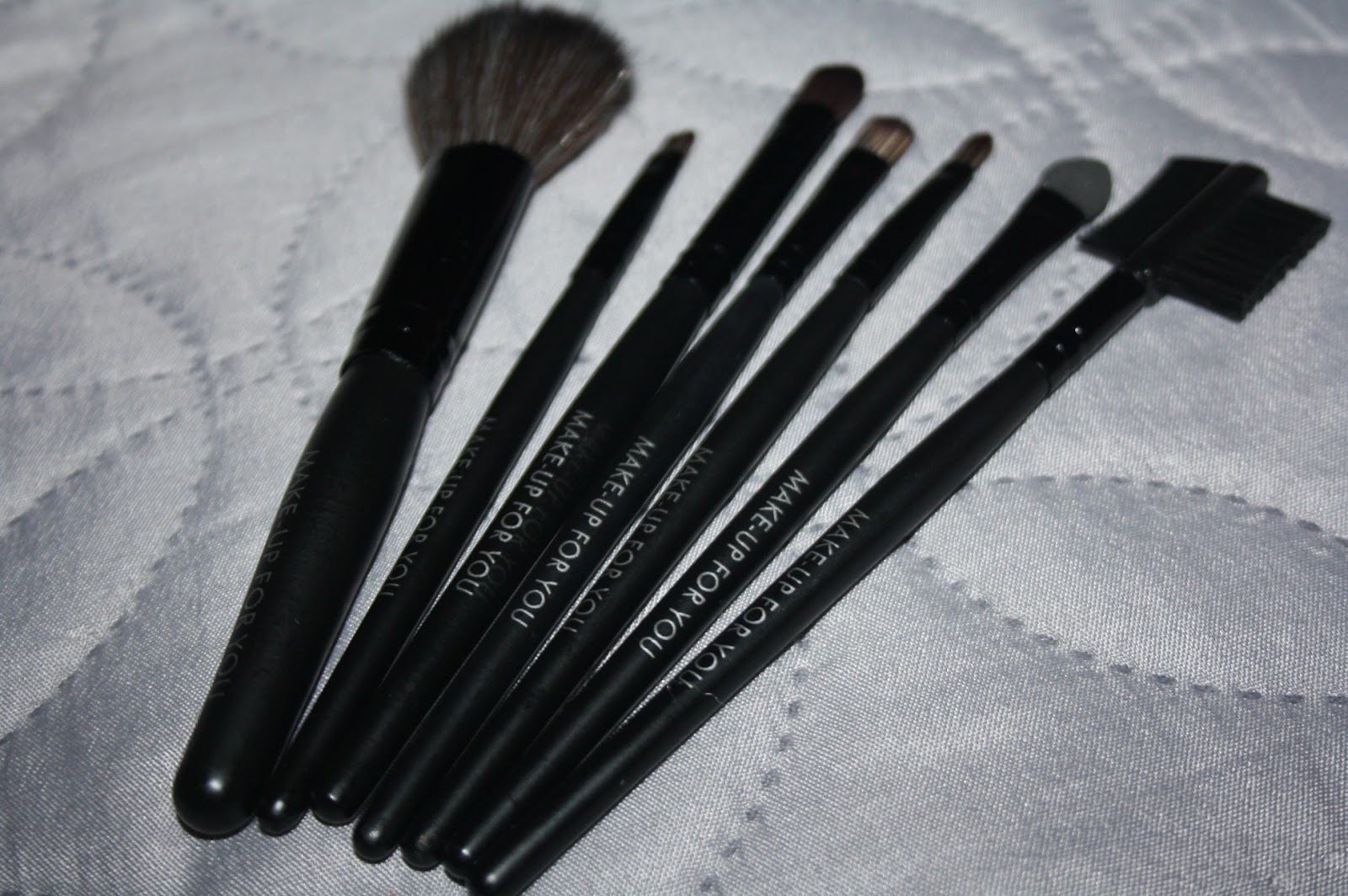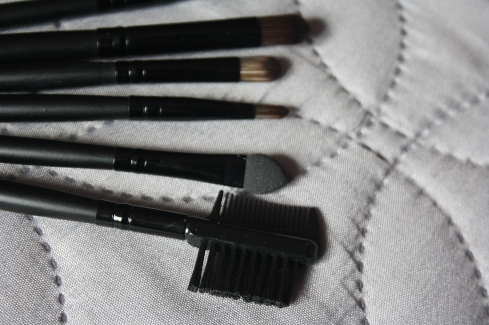 Drugą rzeczą z zamówienia są pędzle, które zamówił mój fotograf. Jest to zestaw siedmiu pędzi do makijażu, każdy przeznaczony do malowania innej partii twarzy. Między innymi: pędzel do różu, powiek, brwi, do nakładania błyszczyku lub pomadki, szczoteczkę do wyczesywania rzęs lub brwi oraz patyczek do powiek (ten z gąbeczką). Wiadomo, że za 12 zł nie należy spodziewać się jakiejś super jakości, ale pędzle są w miarę dobre i dosyć solidnie wykonane. Po przeczesaniu palcami, włosie nie wychodzi. Cały zestaw posiada materiałowe pudełeczko do przechowywania oraz jest dostępny w kilku rożnych kolorach, a Karina wybrała akurat klasyczny, czarny.