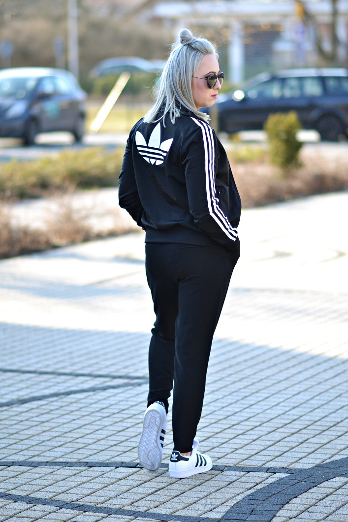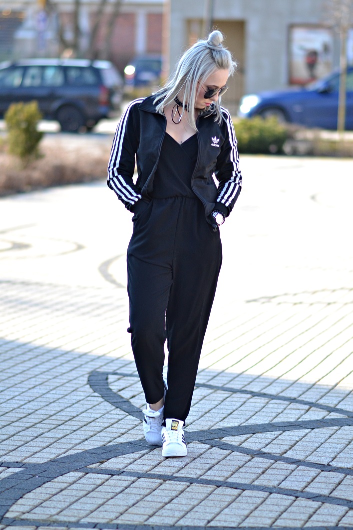Zobacz oryginał wt., 28/02/2017 - 20:49To chyba mój pierwszy tak sportowy look, jednak nie zabrakło tutaj bardziej eleganckiej części jaką jest nie do końca sportowy kombinezon. Kiedy byłam w gimnazjum ( wiele, wiele lat temu ) "superstary" były niesamowicie modne. Teraz już drugi sezon znowu cieszą się popularnością! Moje to prezent gwiazdkowy i czekały cierpliwie na odpowiednią pogodę. Czarny kombinezon kupiłam w sh, ta część garderoby to świetny zamiennik sukienki - równie dobrze wygląda do szpilek. No i sportowa oldschoolowa bluza, wpasowała się tutaj bardzo fajnie!