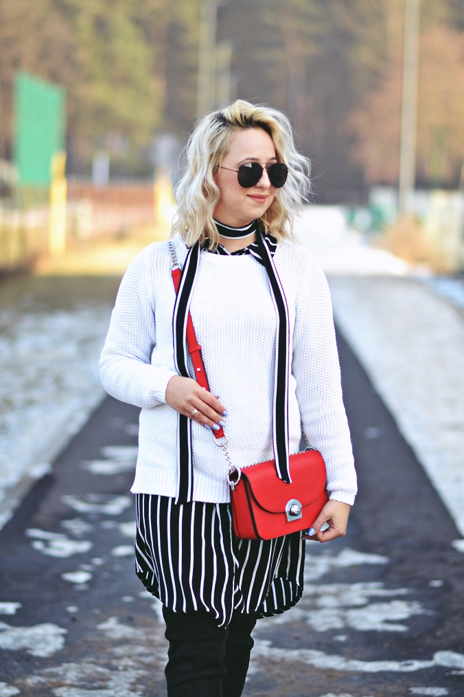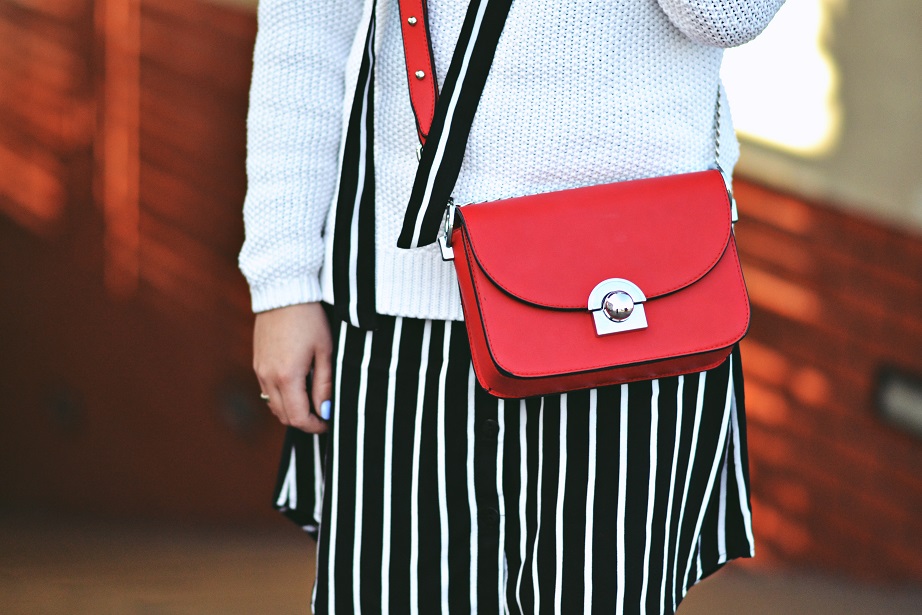 Czerwona torebka to mocniejszy akcent, ot tak żeby było ciekawiej.