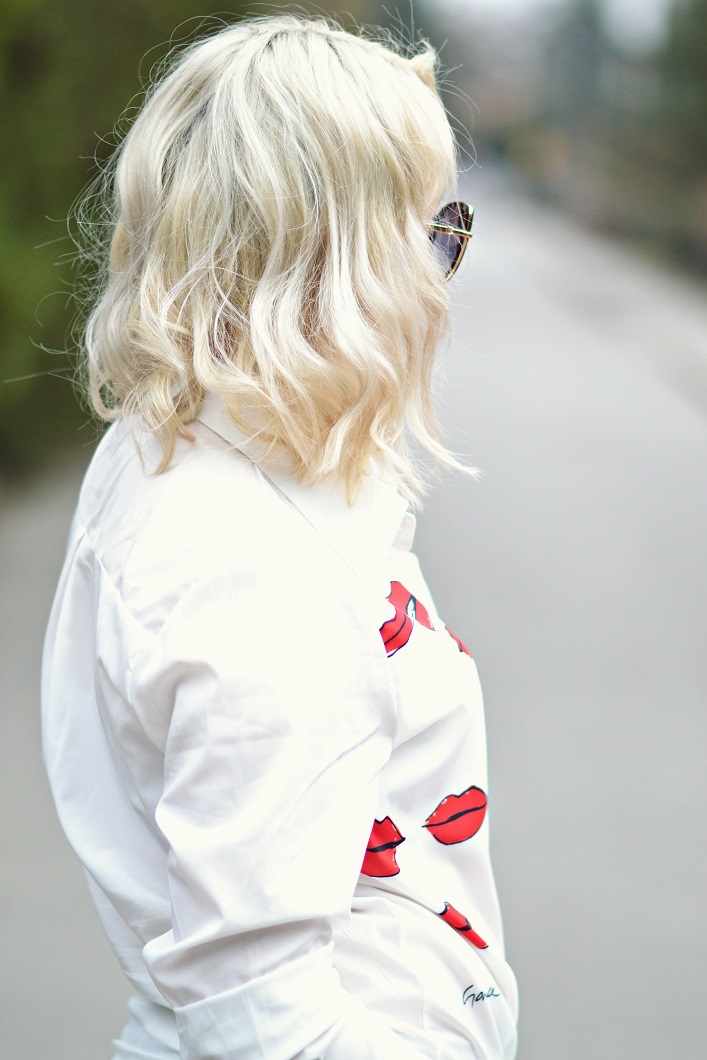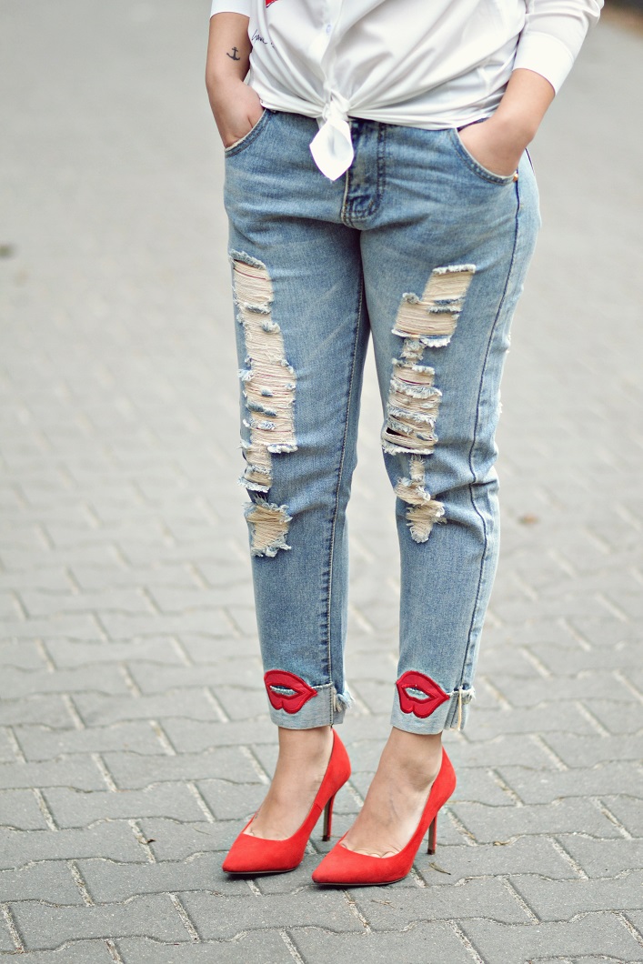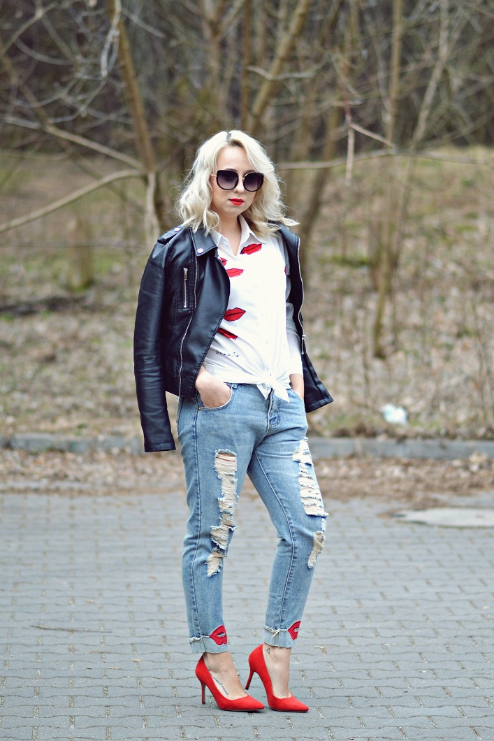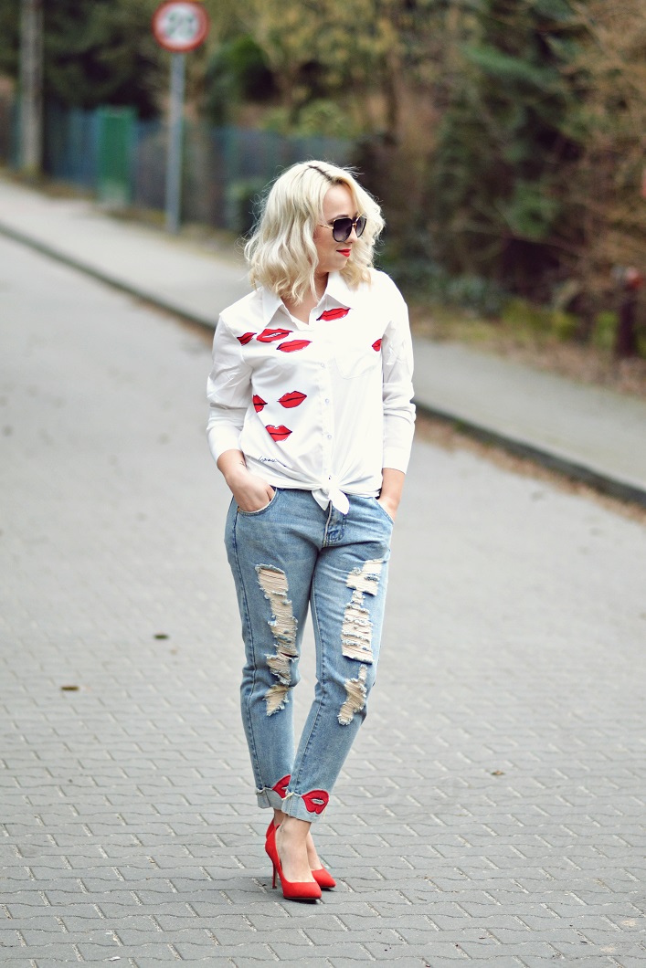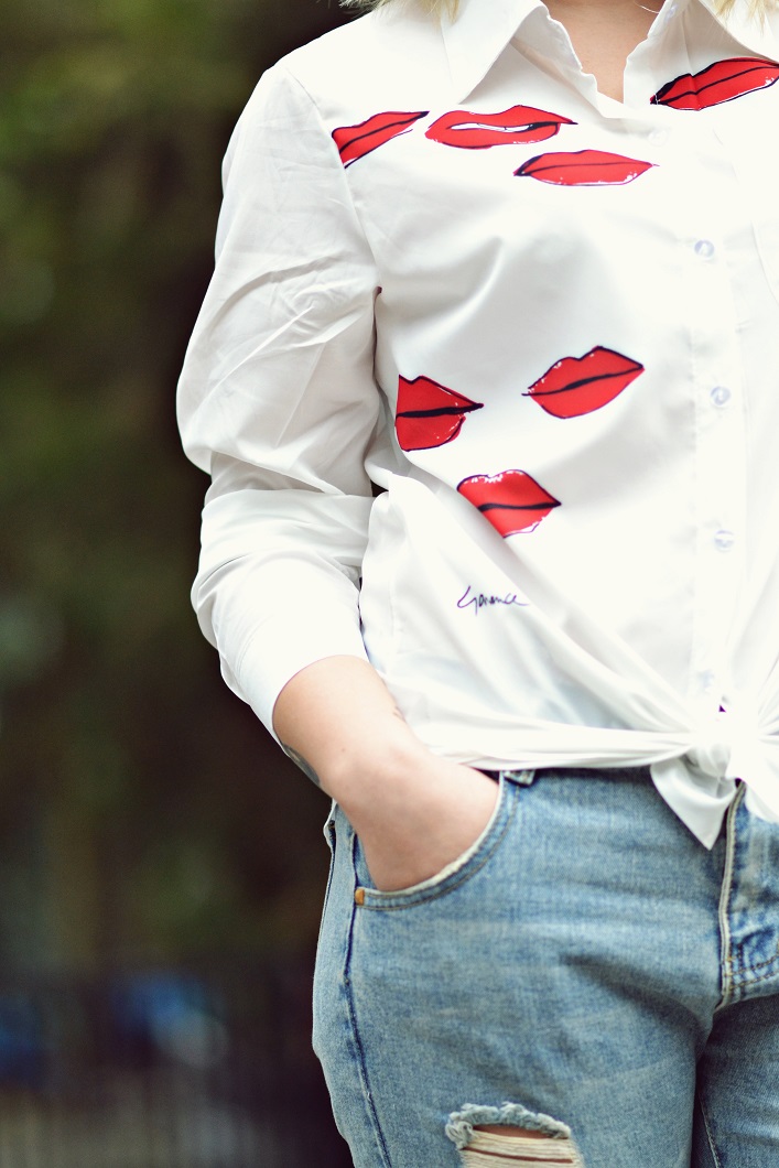 Zobacz oryginał wt., 14/03/2017 - 18:15Dziś pokaże Wam zdecydowanie najbardziej całuśny post ze wszystkich moich stylizacji. Dużo tutaj ust jak i czerwieni. Spodnie z dziurami w typie boyfriend zostały przyozdobione na nogawkach ustami z eko skóry, natomiast biała koszula to mój faworyt. Jest to projekt Garance Dore - fotografki, ilustratorki i blogerki. Ową koszulę możecie kojarzyć z Anne Hathaway , która promowała swój film w stylizacji, której kluczowym elementem była właśnie ta koszula.
