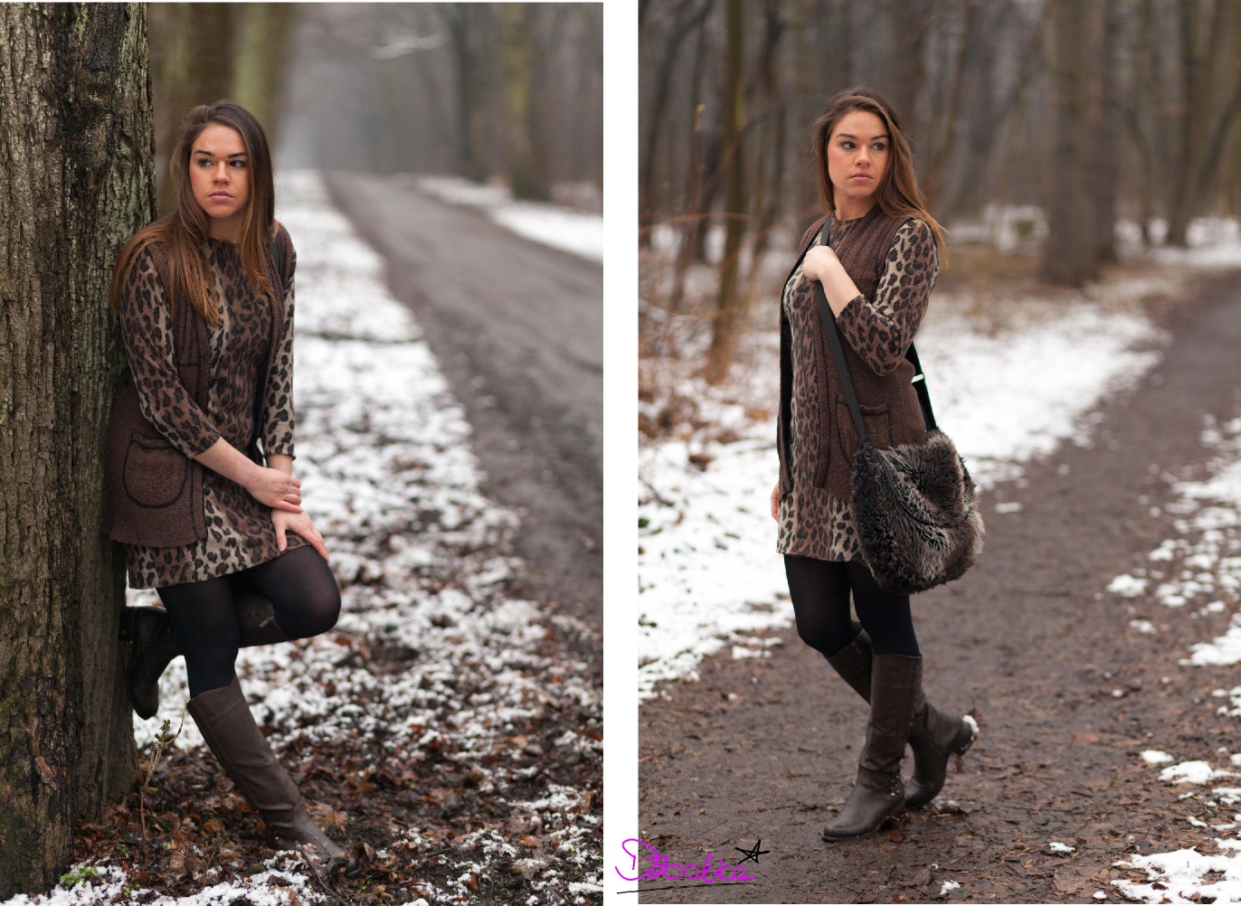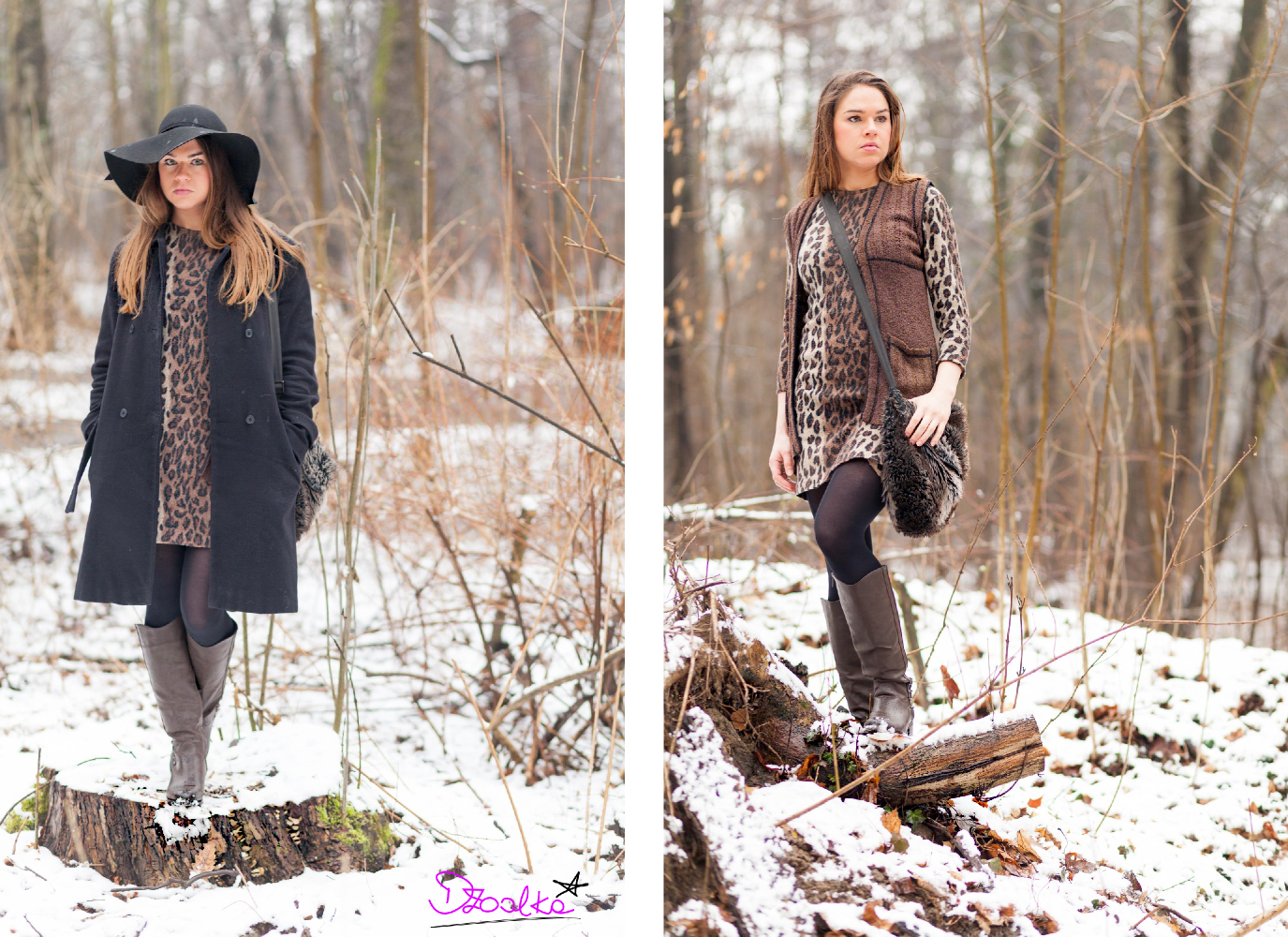 Poz spodem mam prostą sukienkę w panterkę, na którą zawsze narzucam swoje długie, brązowe bolerko (które znacie ze stylizacji z celtycką spódnicą). Dzięki bolerku panterki jest nieco mniej.