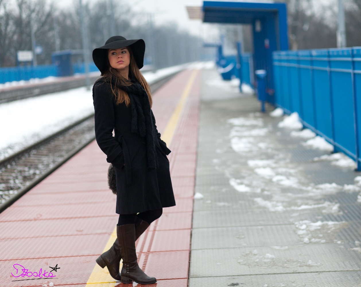 Mam na sobie czarny płaszcz, czarny kapelusz, czarny szalik z kapturem i przełamujące ową czerń - brązowe kozaki i "futrzastą torebkę".