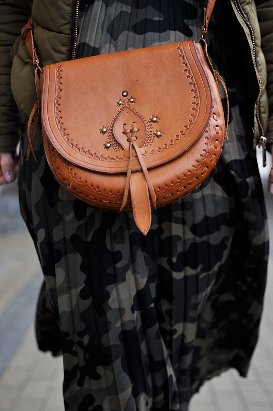 Nie mogłam się oprzeć tej spódnicy. Oczywiście przede wszystkim, że plisowana, a poza tym ten wzór doprawdy mnie urzekł. Do tego iście wojskowe buty, no bo przecież za kolano. Mimo, że słupki rtęci wędrują coraz bardziej ku górze, nie chowajcie ich jeszcze na spód szafy. Kozaki za kolano sprawdzą się jeszcze wiosną, więc warto mieć je pod ręką. Torebkę za to dopasowałam na zasadzie kontrastu. Lubię przemycać do stylizacji elementy z pozoru niepasujące. Tutaj torebka góralska podkówka. Dorobiła się już wymyślonej historii, jak większość z lumpeksowych zdobyczy.