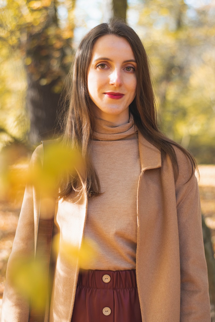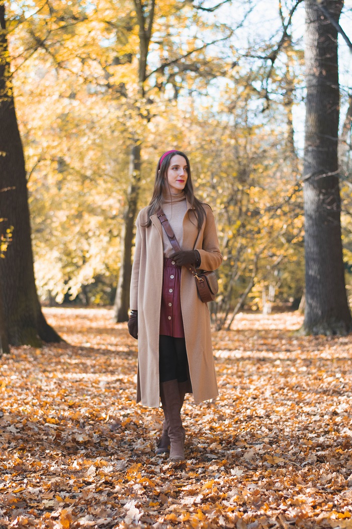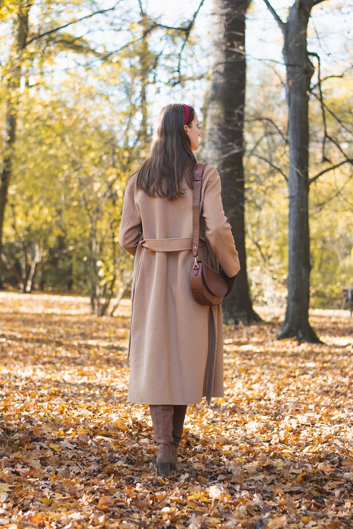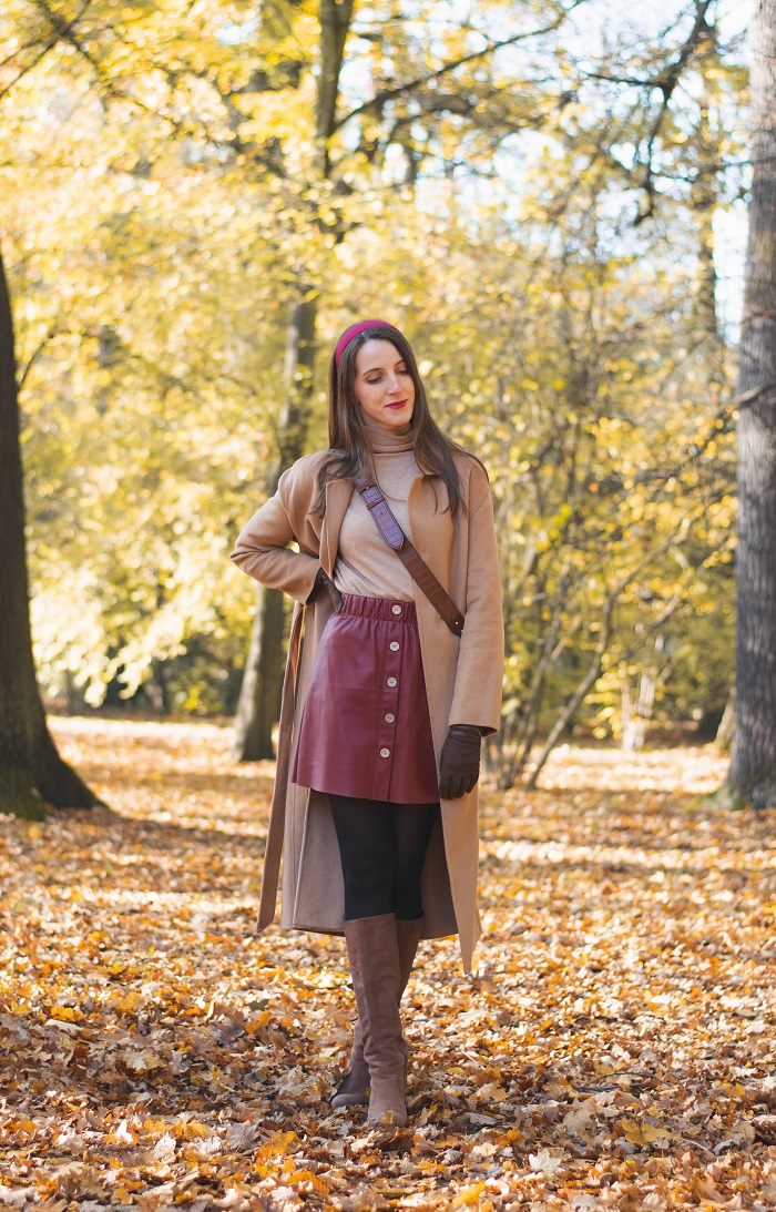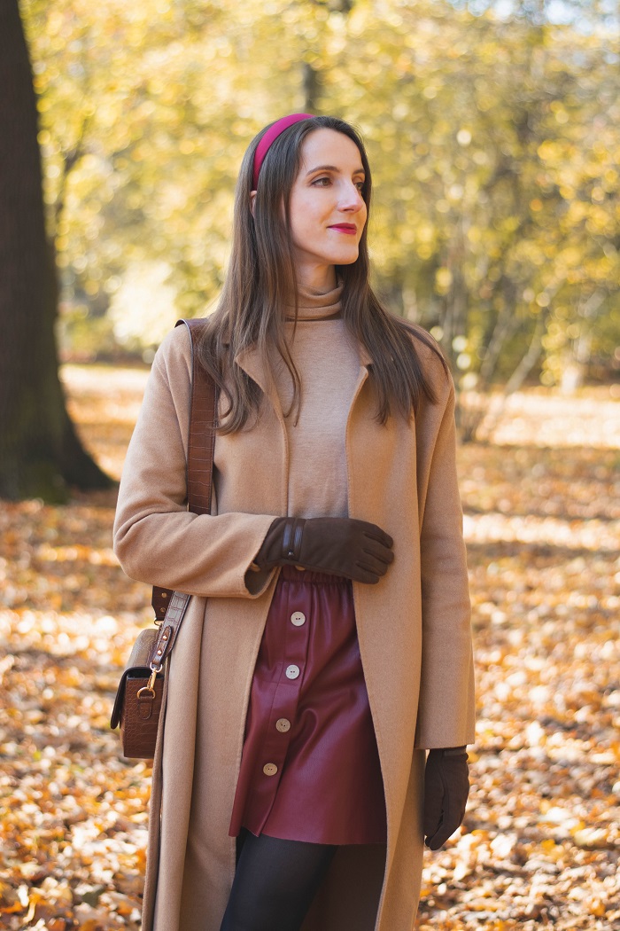 Podejrzewam, że to już ostatnie typowo jesienne momenty, kiedy to możemy się cieszyć pięknym dywanem z żółtych liści i delikatnie rozproszonym światłem . Kiedy dzień robi się coraz krótszy, a słońce chowa się zbyt szybko, zanim zdążymy się nim nacieszyć. Przed nami ponure tygodnie, które mogą odbierać nam energię i chęć do działania. Dlatego nie dajmy się zimowej chandrze, znajdźmy zajęcie, które sprawia nam przyjemność i dbajmy o siebie. Grudzień powinien kojarzyć się pozytywnie, szczególnie święta oraz okres noworoczny, kiedy wreszcie mamy czas na trochę odpoczynku, wspólne chwile z bliskimi i rodziną, ładujemy baterię przed nowymi wyzwaniami i nowym rokiem. A póki co, łapię ostatnie słoneczne chwile w Parku Szczytnickim, który obecnie wygląda naprawdę bajecznie. Dzisiejsza stylizacja utrzymana jest w ciepłej tonacji - jest beż, ruda skóra i brązy, a także opaska w kolorze czerwonego wina. Dalej trzyma się mnie elegancki styl i podejrzewam, że przez bliższe miesiące tak zostanie. Coraz bardziej mi on odpowiada, nawet na co dzień i bez okazji.