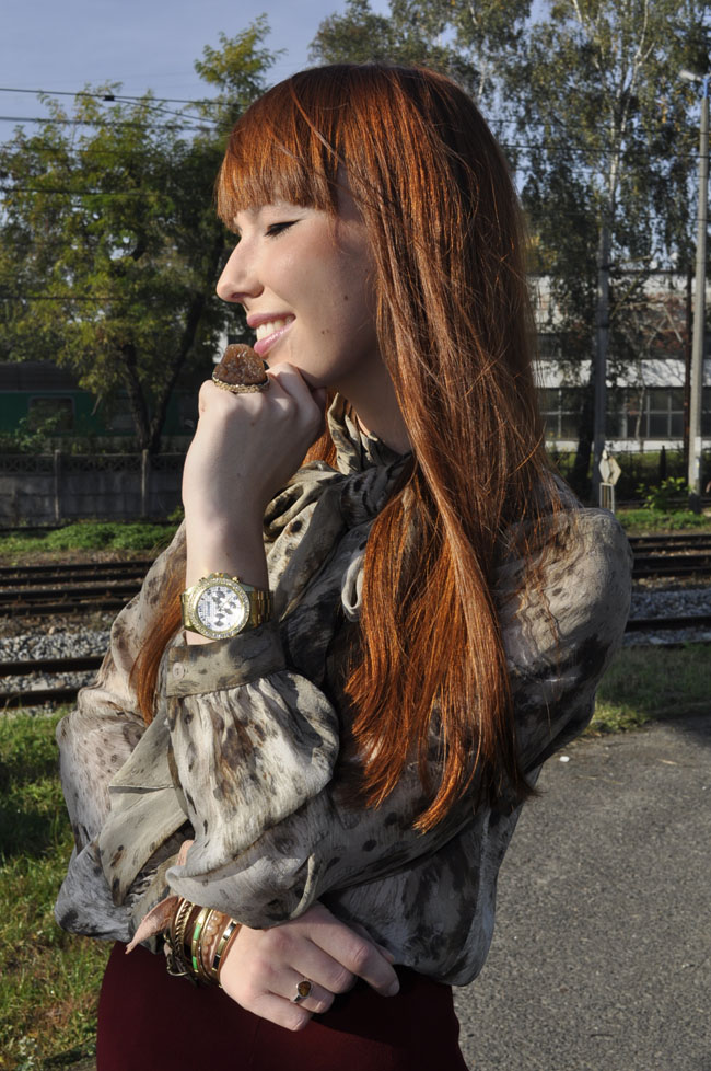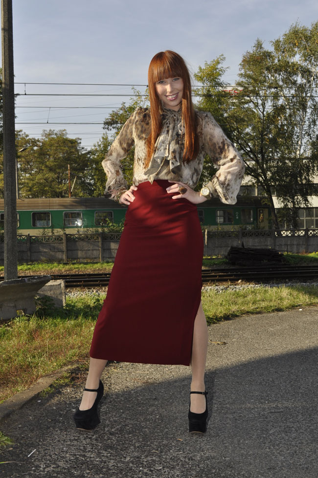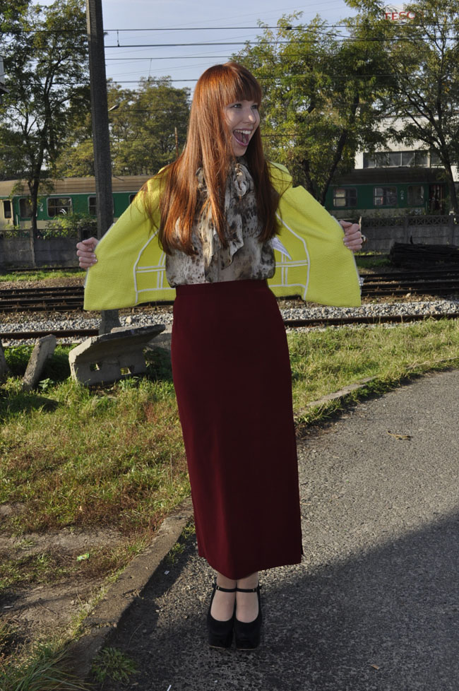 Zobacz oryginał pon., 17/12/2012 - 09:59Kiedy za oknami ziąb i śnieżyca, ogrzewa mnie wspomnienie ciepłych jesiennych dni. Między świąteczną aurą i zapachem pierników, przewija się taśma pełna słońca i wszelakich barw. Zanim więc pokażę Wam swoje futra, ostatnia w pełni jesienna stylizacja. Nasz klimat coraz to bardziej mnie zaskakuje, płatając nam mniejsze i większe figle. Po październikowym śniegu przyszedł czas na listopadowe gorące słońce. Takie chwile staram się wykorzystywać na sto procent i wyciskać jak cytrynkę! Postawiłam więc na nieco kontrastu. Bordową midi z rozporkiem kupiłam w second handzie i zestawiłam ją z cieplejszym limonkowym żakietem. Delikatna i zwiewna bluzka z motywem zwierzęcym zwieńczyła całość.