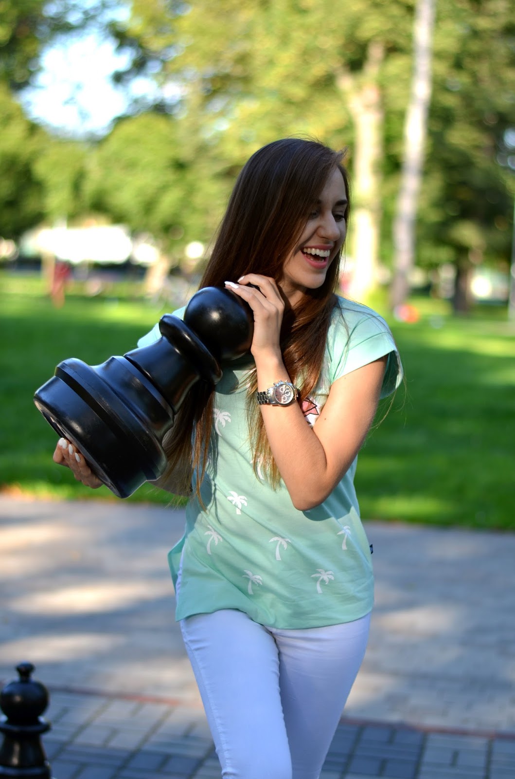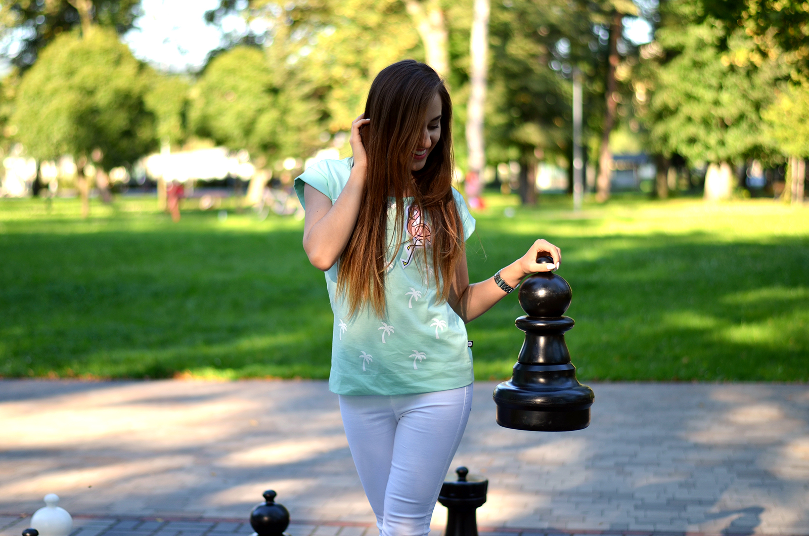 Zobacz oryginał czw., 25/08/2016 - 20:30Witajcie Kochani:) Dzisiejsza sesja wyszła spontanicznie. Pomysł był całkiem inny, natomiast gdy zobaczyłam w parku ludzi grających w szachy od razu ruszyłam z zapytaniem czy mogę zrobić kilka zdjęć;) Główną rolę w dzisiejszym zestawie robi miętowy T-shirt ze sklepu Avocado, który nie dość, że wygląda przeuroczo to jest bardzo dobrej jakości. Ja połączyłam go z białymi spodniami, jednak super będzie prezentował się również wpuszczony w jeansowe szorty z wysokim stanem. Nie zabrakło tutaj również jednych z najwygodniejszych sandałków jakie mam Zaxów, które są aktualnie na przecenie:)