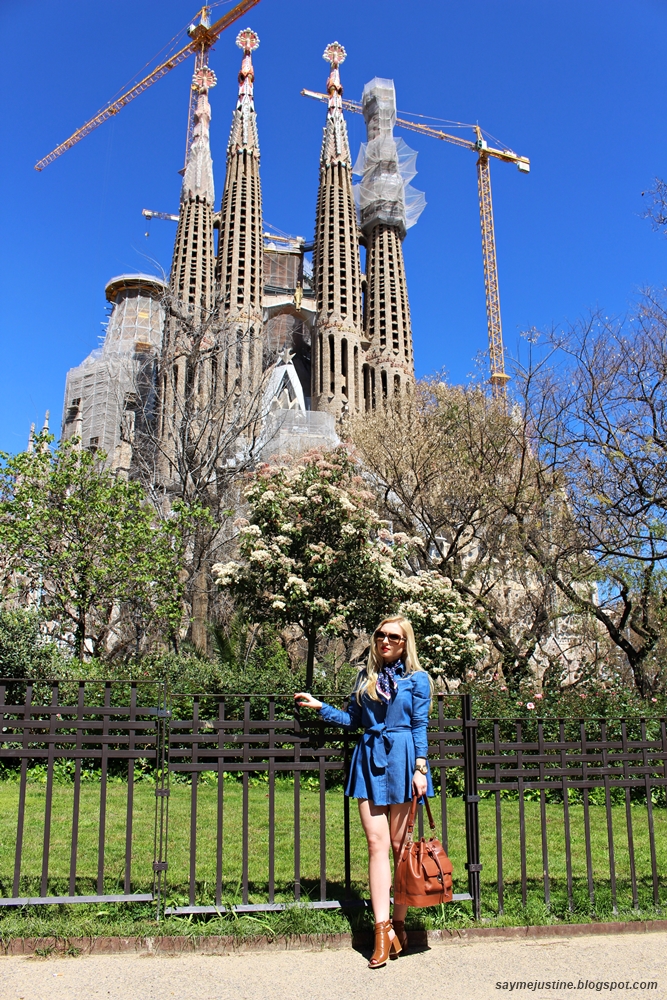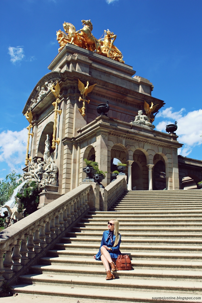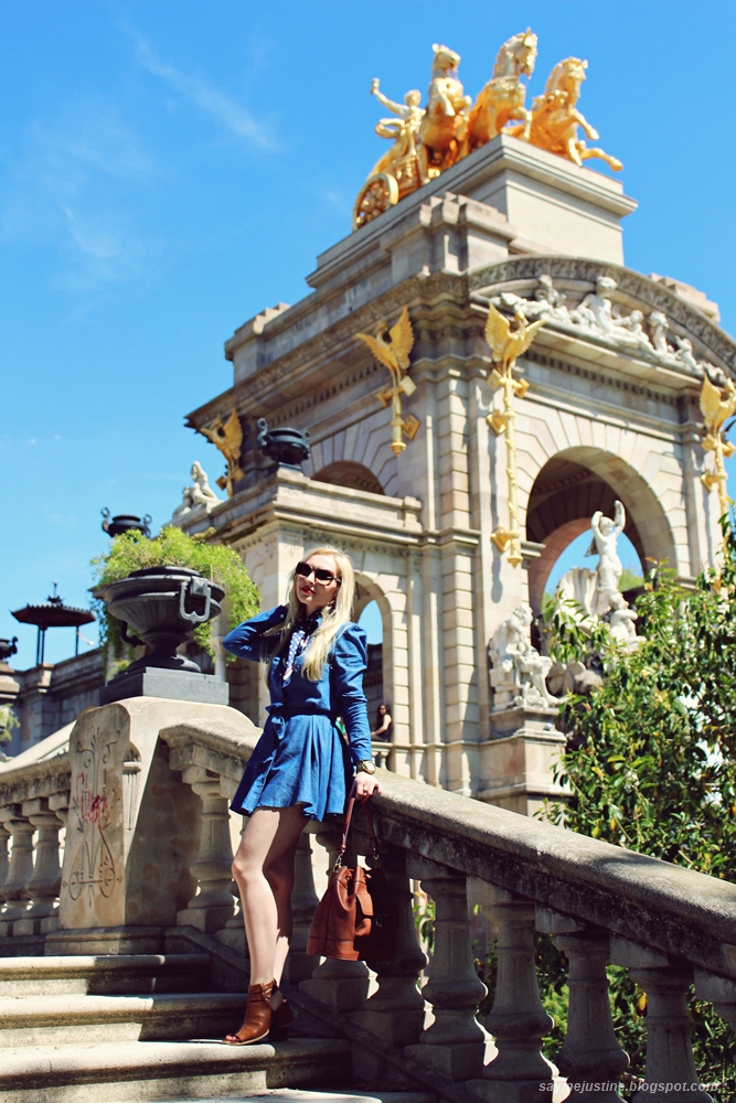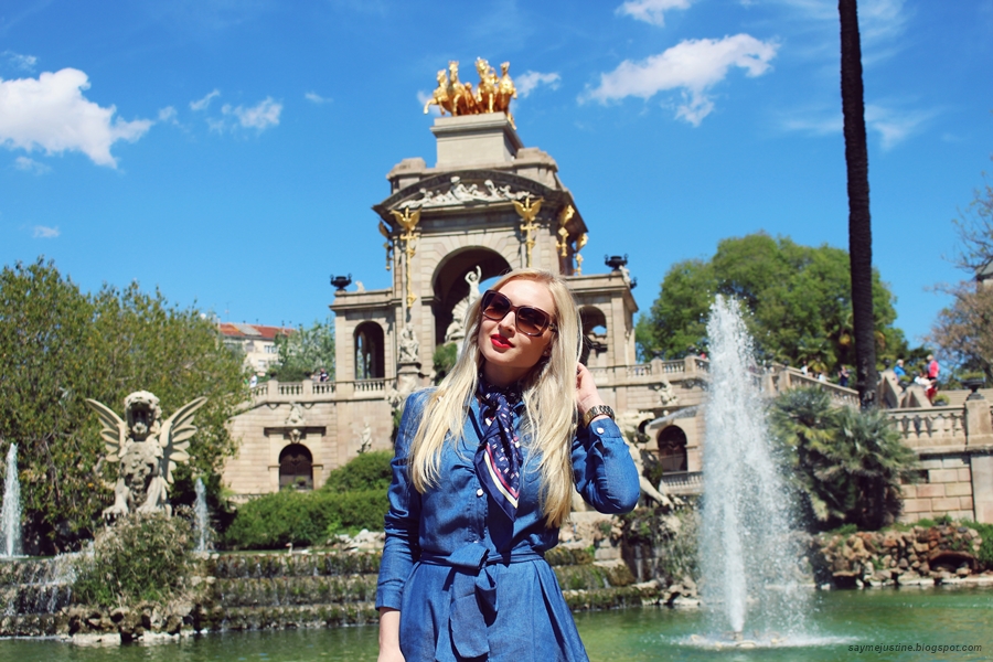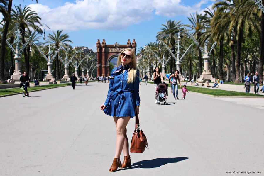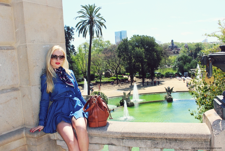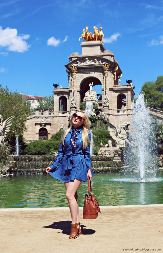 Dzisiaj zabieram was na spacer po Barcelonie, zaczniemy od parku Ciutadella, przejdziemy do Luku Triumfalnego i na koniec dojdziemy do jednej z najwiekszych atrakcji turystycznych w Barcelonie czyli do Katedry Swietej Rodziny. Na ten dzien wybralam jeansowa sukienke, do ktorej dobralam brazowe dodatki i granatowa apaszke, czyli ostatni hit! Jesli jeszcze nie macie apaszki w swoich garderobach to czas zmienic, to wlasnie one potrafia dodac smaku kazdej stylizacji.