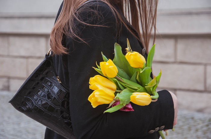 Chociaż stylizacja nie wygląda jeszcze typowo wiosennie, to energetycznym akcentem są z pewnością kolorowe tulipany. Do tego lekka sukienka midi w drobne groszki, torebka bagietka (wciąż w trendzie) oraz zimowe elementy - skórzane kozaki i wełniana, dwurzędowa marynarka. Jest kobieco i idealnie na przejściową porę ze zmienną pogodą.