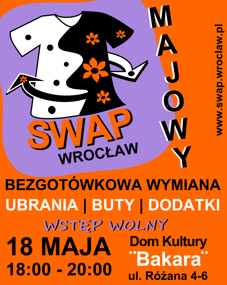 Zobacz oryginał wt., 16/05/2017 - 16:58W najbliższy czwartek 18 maja od godziny 18:00 przez dwie godziny mieszkanki Wrocławia będą wymieniać się ubraniami podczas bezgotówkowej wymiany ubrań z cyklu SWAP Wrocław. Impreza odbędzie się w domu kultury "Bakara" przy ul. Różanej 4-6.