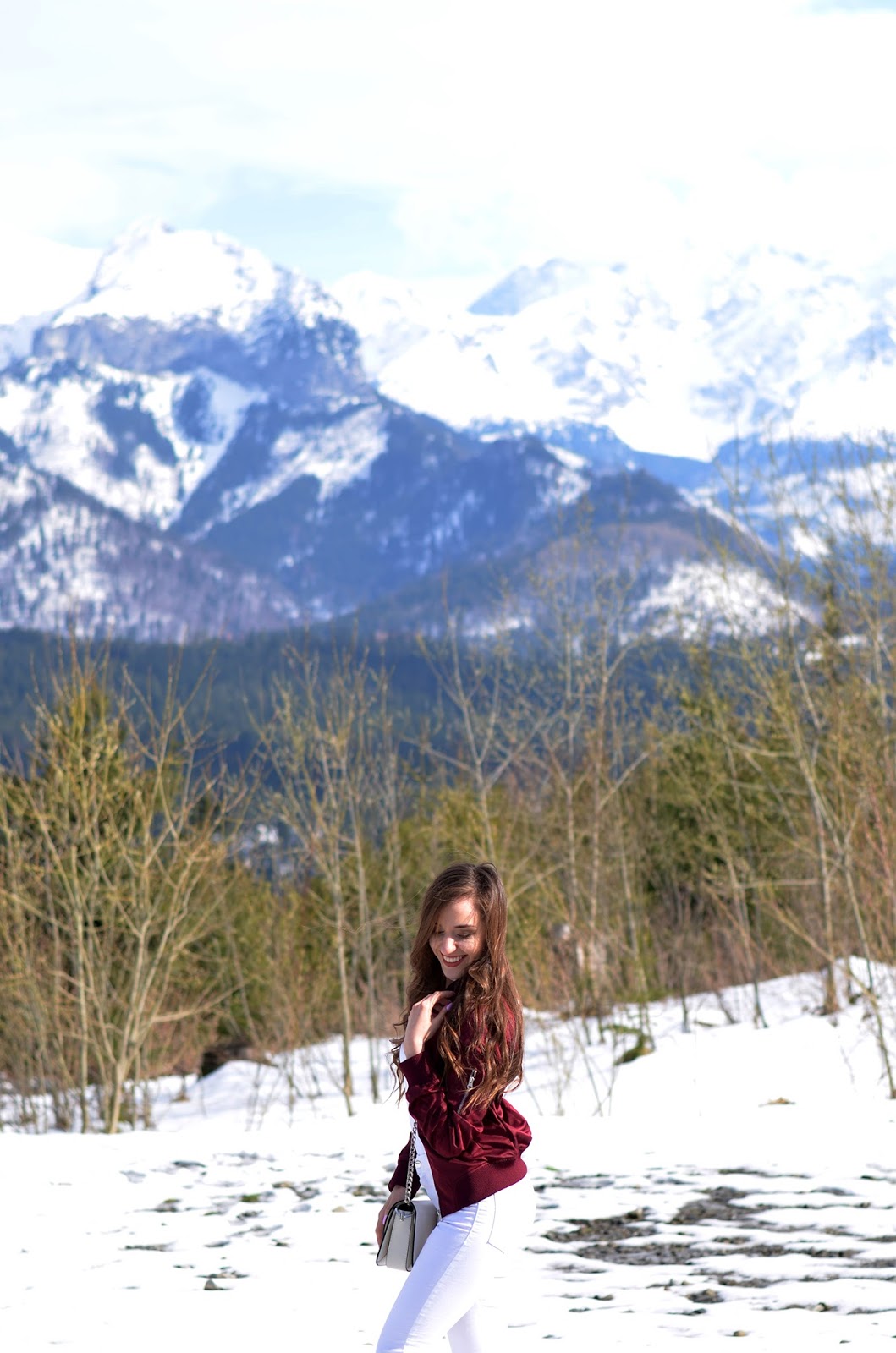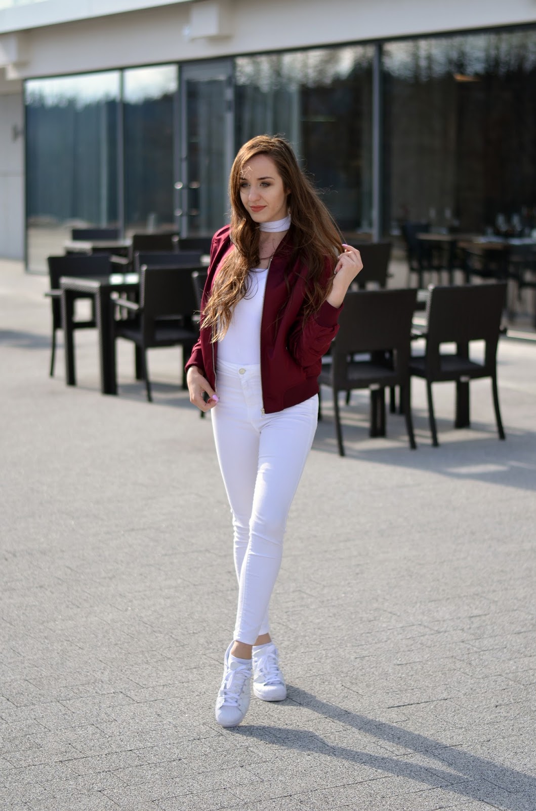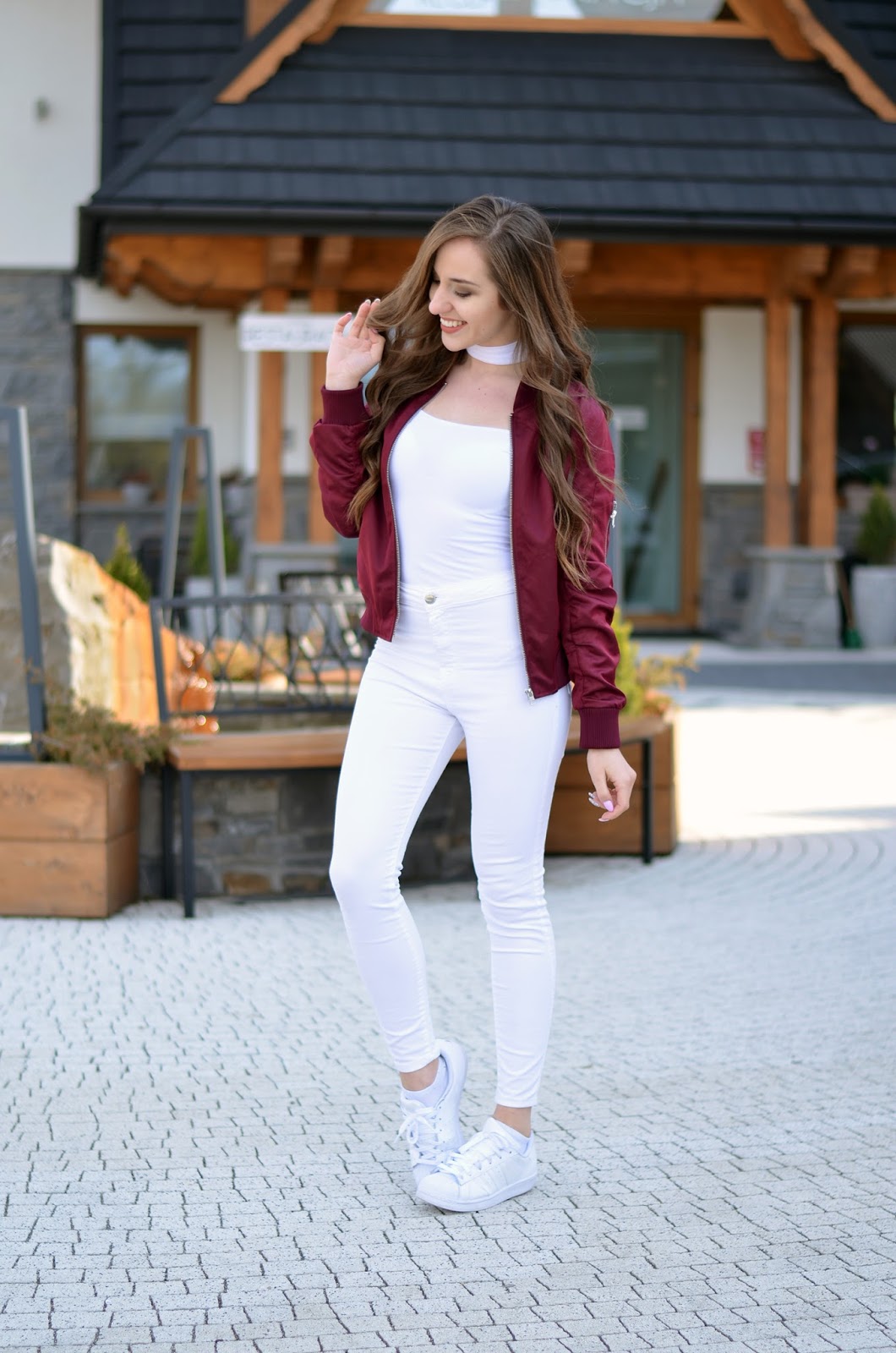 Zobacz oryginał sob., 29/04/2017 - 13:00Witajcie:* Dzisiaj wyjątkowo sesja złożona z trzech w różnych miejscach. Wiele razy wspominałam, że mieszkam na Podhalu, tutaj potrafi być tak zmienna pogoda, że jednego dnia jest lato, drugiego dosłownie zima. Tak samo jadąc 10 km dalej zmienia się całkowicie krajobraz i zamiast zieleni leży jeszcze sporo śniegu. Mimo tego, że jestem zmarzluchem i ciągle narzekam na zimno, to jednak lubię tu mieszkać, bo jest wyjątkowo ładnie:) Miał być początkowo white total look (oj moje zamiłowanie to total look'ów), jednak po zmianie bomberki na bordową uznałam, że wygląda to dużo ciekawiej i nadaję fajnego charakteru. Tym razem wracam do wygody i ukochanych adidasów, ale fani obcasów, nie obawiajcie się szykuję również takie!;) Długi weekend u mnie zapowiada się spontanicznie i wyjątkowo zamiast kolejnych wyjazdów posiedzę trochę na Podhalu;) A jak Wasze plany? I jak podoba Wam się najnowszy zestaw? Zapraszam również na instagram z dużą ilością zdjęć @balaczka oraz fanpage tutaj, 2 dni temu wybiło 12 tys, dziękuję:*