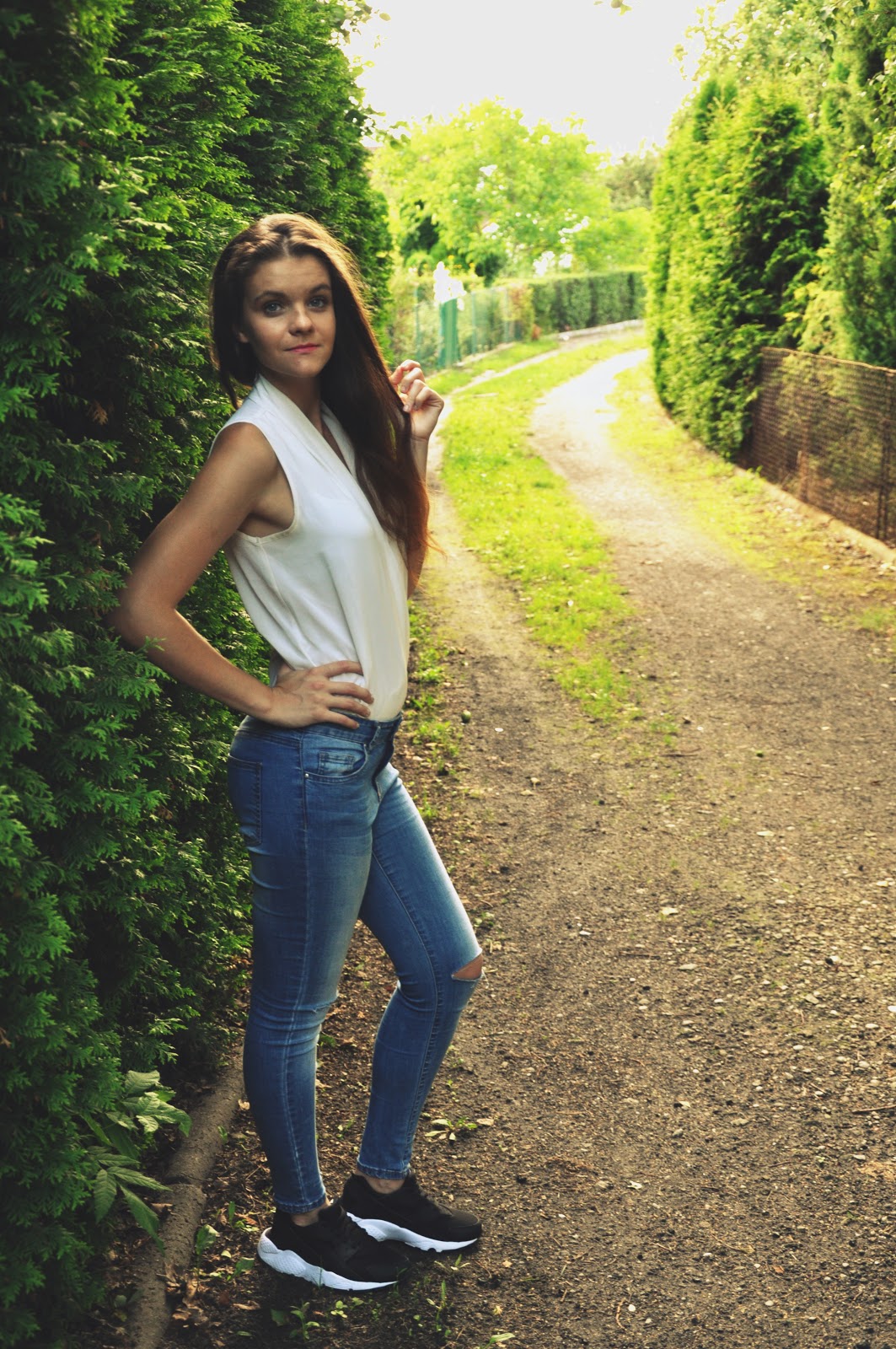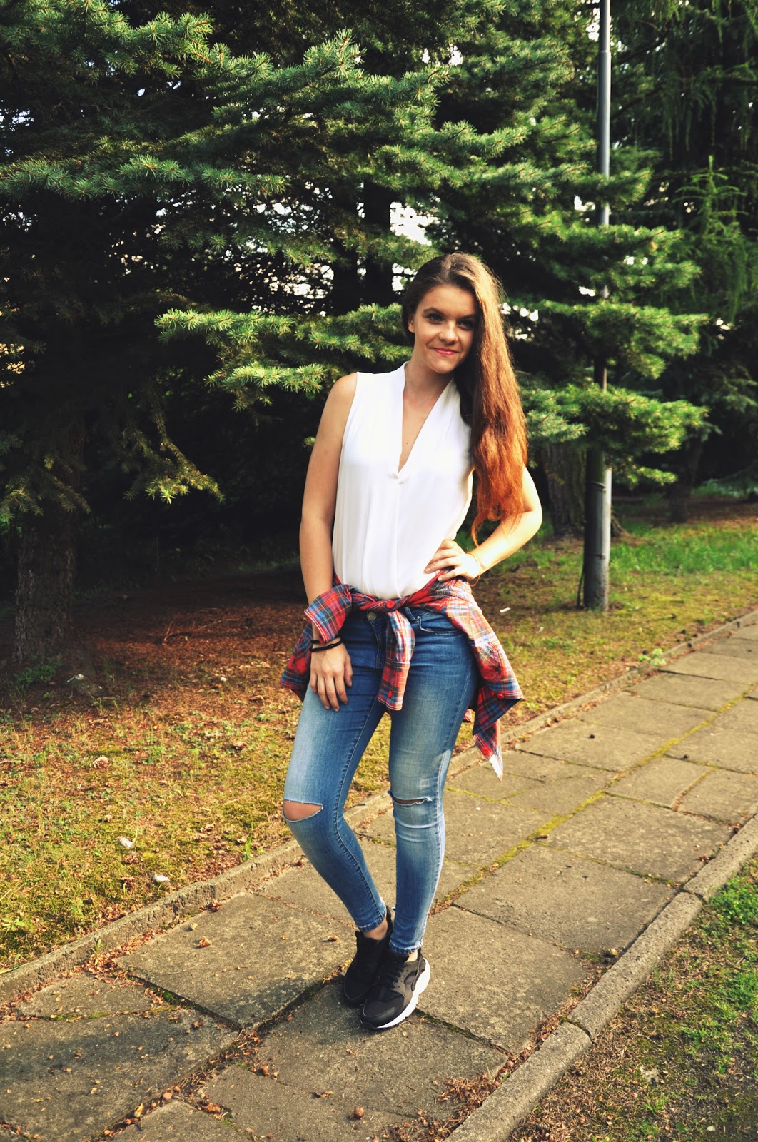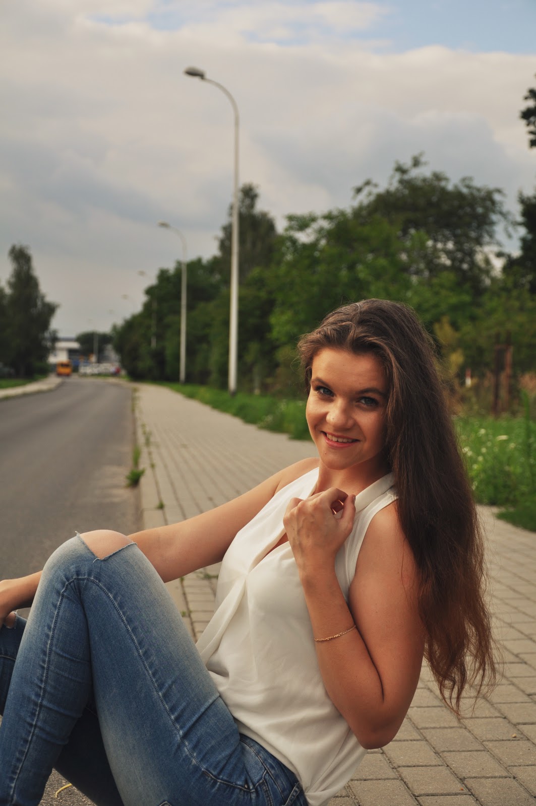 W weekendzior udało mi się zrobić kilka fotek, choć miałam chwilę zwątpienia czy w ogóle one wyjdą. Mam nadzieje że pogoda niedługo będzie lepsza, bo nie wiem jak u was ale u mnie jest chłodno i często pada :/ A mamy lipiec, więc gdzie te letnie temperatury ? Stylizacja jest prosta, biała bluzeczka do jeansów z dziurami na kolanach. Co do bluzki, często muszę się poprawiać, ma bardzo głęboki dekolt (choć na zdjęciach nie widać tego) i się zsuwa. Jeansy kupiłam w sinsay, nigdzie indziej nie mogłam podobnych zdobyć. Do tego przepasałam sobie w pasie koszulę w kratę, którą widać na paru zdjęciach :P Do tej stylizacji każdy może dobrać coś wyjątkowego aby nadać jej pazura. Muszę zaopatrzyć się w jakąś bomber jacket w fajnym kolorze :) Idealnie by przypasowała się do reszty zamiast koszuli w kratę :)