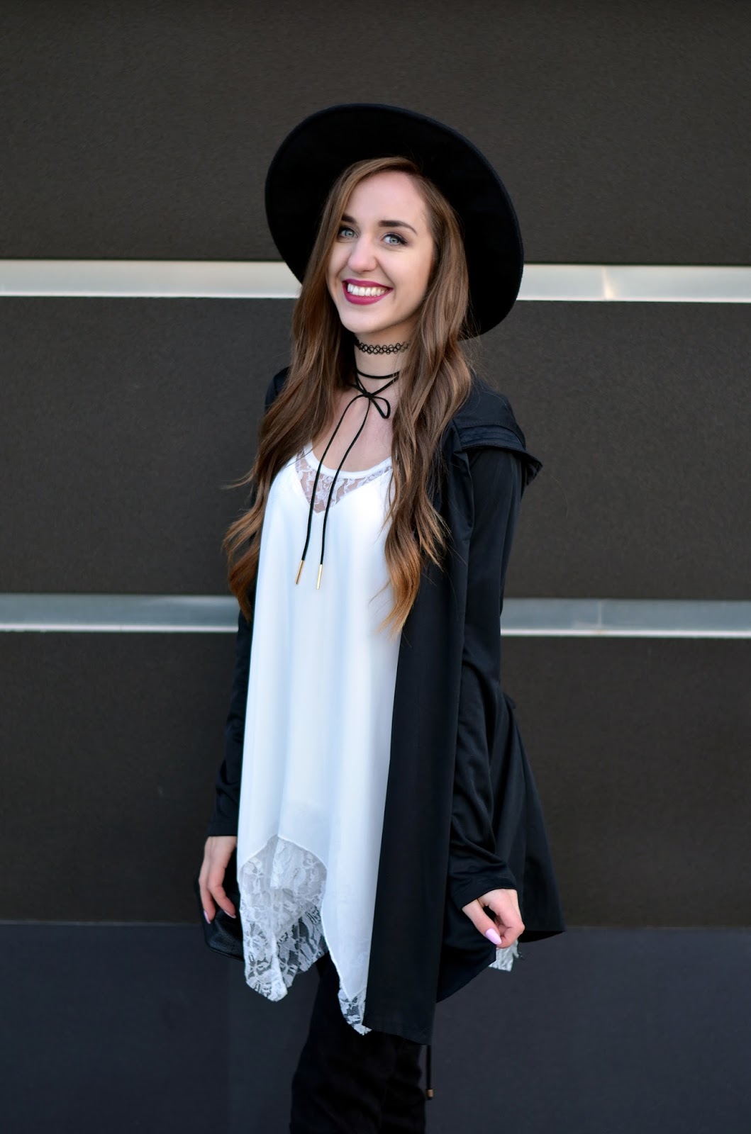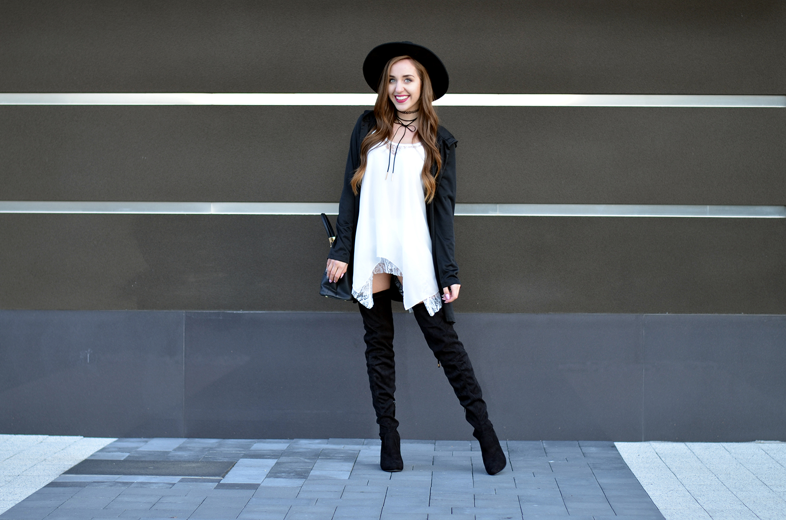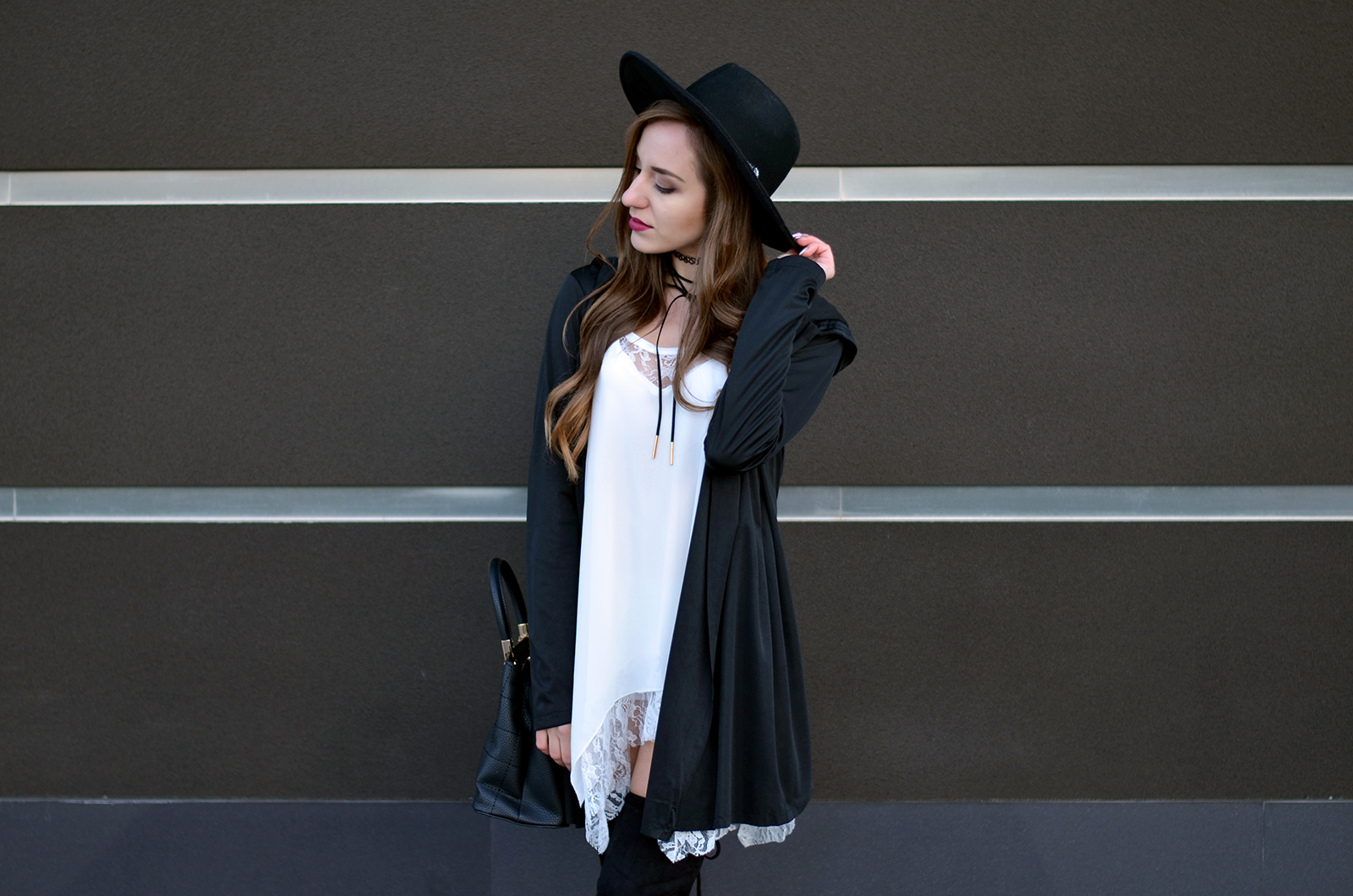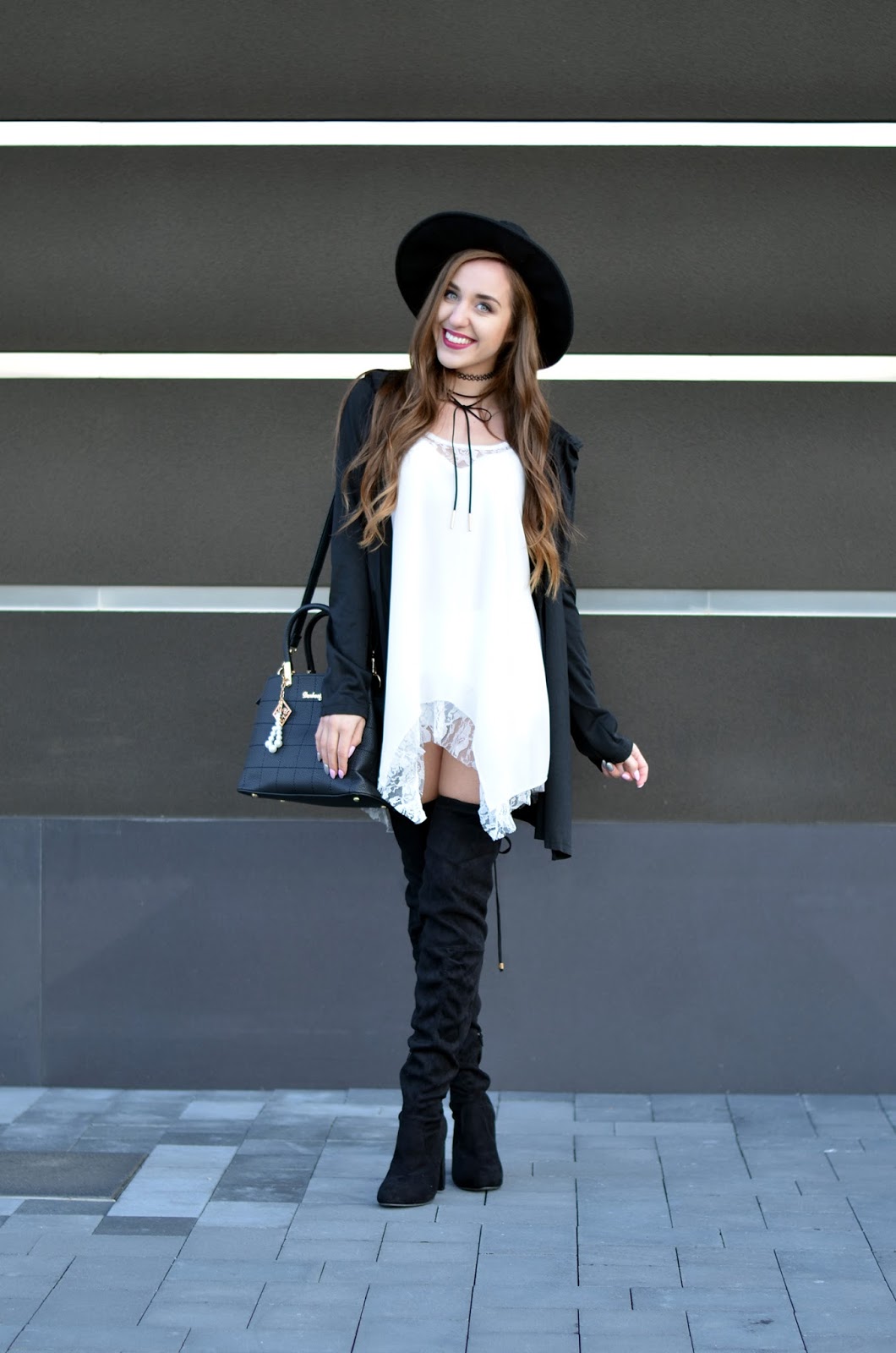 Witajcie:) Jak Wam minął weekend? Mój bardzo pracowicie, pogoda dopisała i przy okazji udało mi się zrobić mnóstwo zdjęć:) Czarno-białe zestawy chyba nigdy mi się nie znudzą. Moja szafa jest w tym momencie głównie czarno-biało-szaro-różowa, ale na szczęście pojawiają się w niej powoli elementy bordowe i beżowe. W dzisiejszym zestawie połączyłam zwiewną sukienkę z koronką do wysokich czarnych kozaków, dobrałam kapelusz oraz najmodniejszy naszyjnik w tym sezonie choker (a tak właściwe to dwa;) Drobne złote elementy przy kozakach czy torebce uzupełniają fajnie całość. Pod tego typu asymetryczne sukienki warto założyć białe szorty - jest dużo bezpieczniej i troszkę cieplej (oj nie mogę sobie wyobrazić jak będzie coraz chłodniej). Kochani zbliża się Halloween - fajne ciuszki i ciekawe przebrania znajdziecie TUTAJ. Zapraszam Was również na instagram tutaj oraz snapchat balaczka ;*