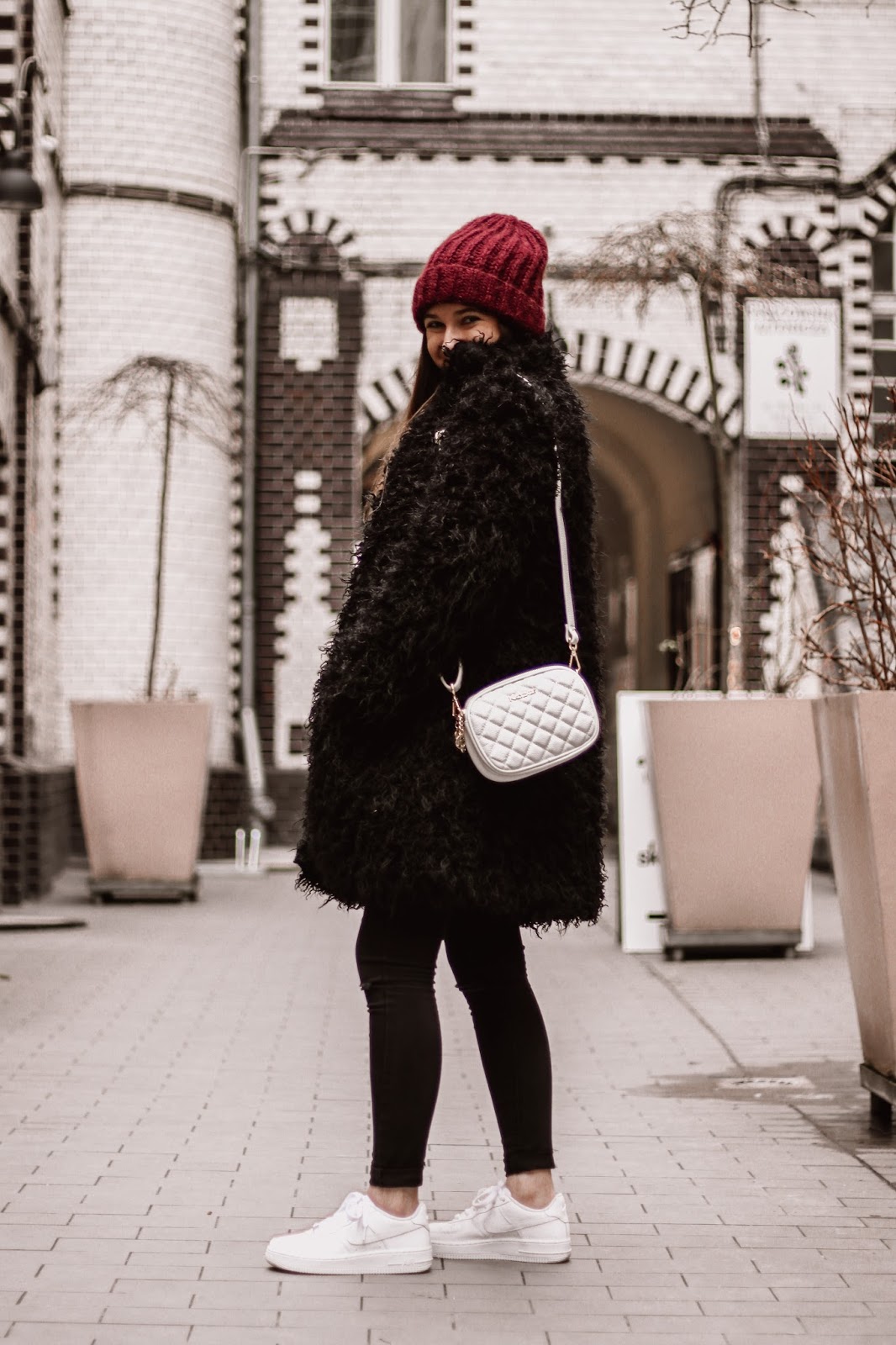 Nie chciałam zrobić całej BLACK and WHITE stylizacji ( O DZIWO!), dlatego całość przełamałam już Wam znaną bordową czapeczką z Be free, która pasowała wtedy do moich paznokcji, hihi :)
