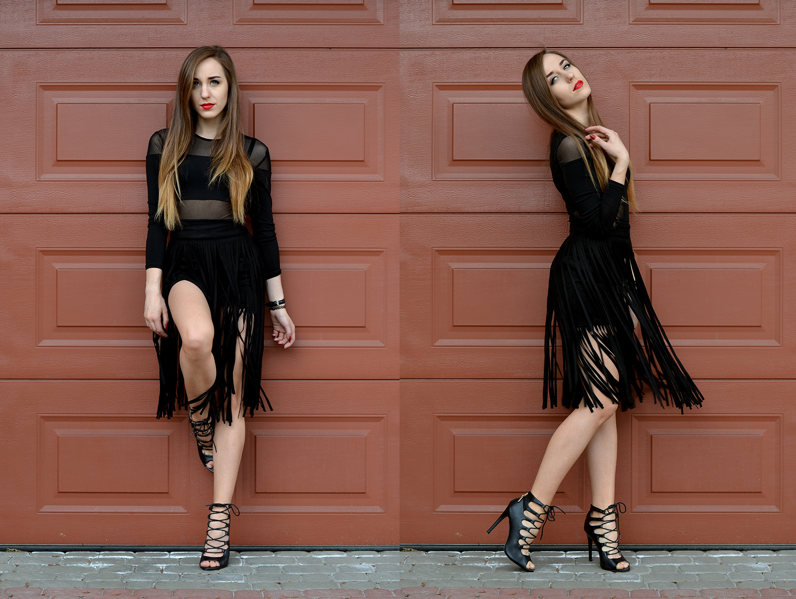 Zobacz oryginał pt., 01/04/2016 - 22:00Witajcie Kochani:) Dzisiaj również się nie rozpisuję, jest już późno, ale udało mi się wyrobić z nowymi zdjęciami i zestawem:) Ostatnio pokazywałam Wam zestaw w białej sukience z czerwienią. Tym razem postawiłam na czerń i czerwone usta. Bardzo dużo się tutaj dzieję, frędzle, wiązania, transparentność - uwielbiam czasami tak trochę poszaleć. Oczywiście najłatwiej w obrębie jednego koloru;) Tutaj jako bluzki znów użyłam sukienki. Mam nadzieję, że całość Wam się podoba.