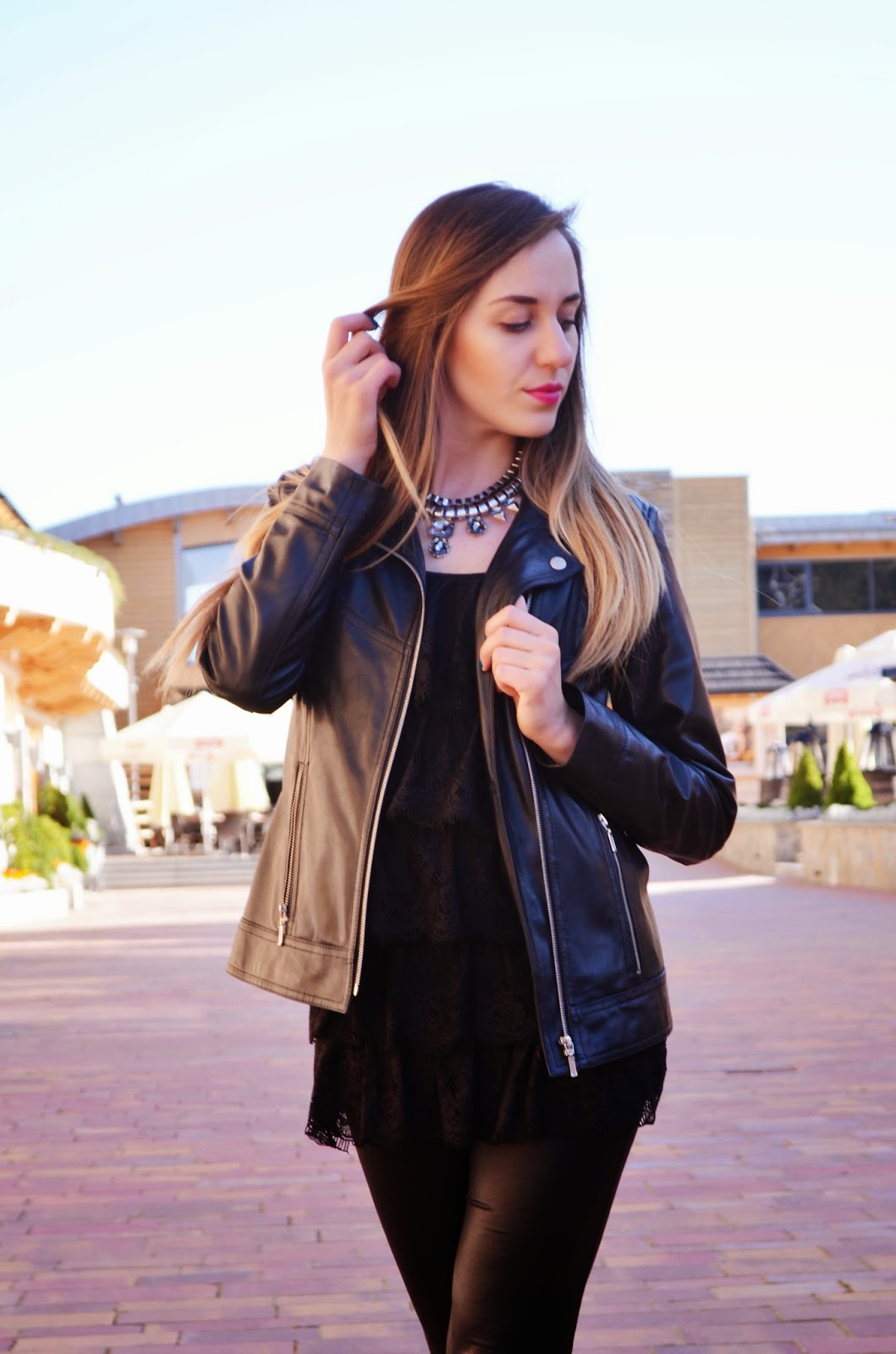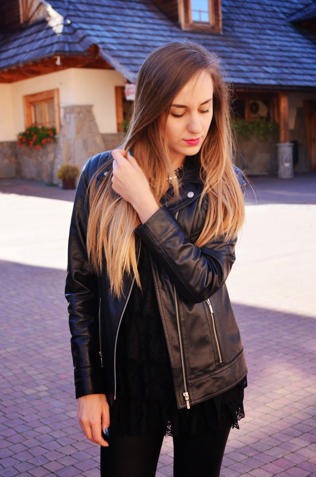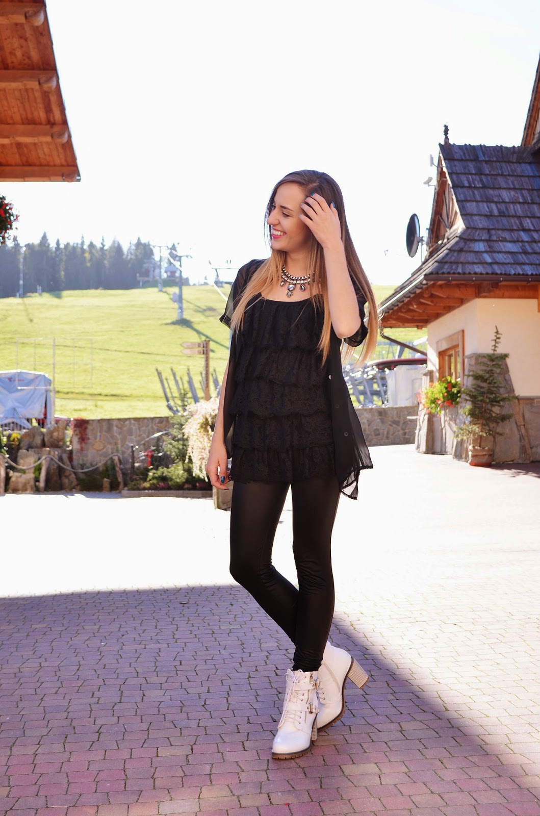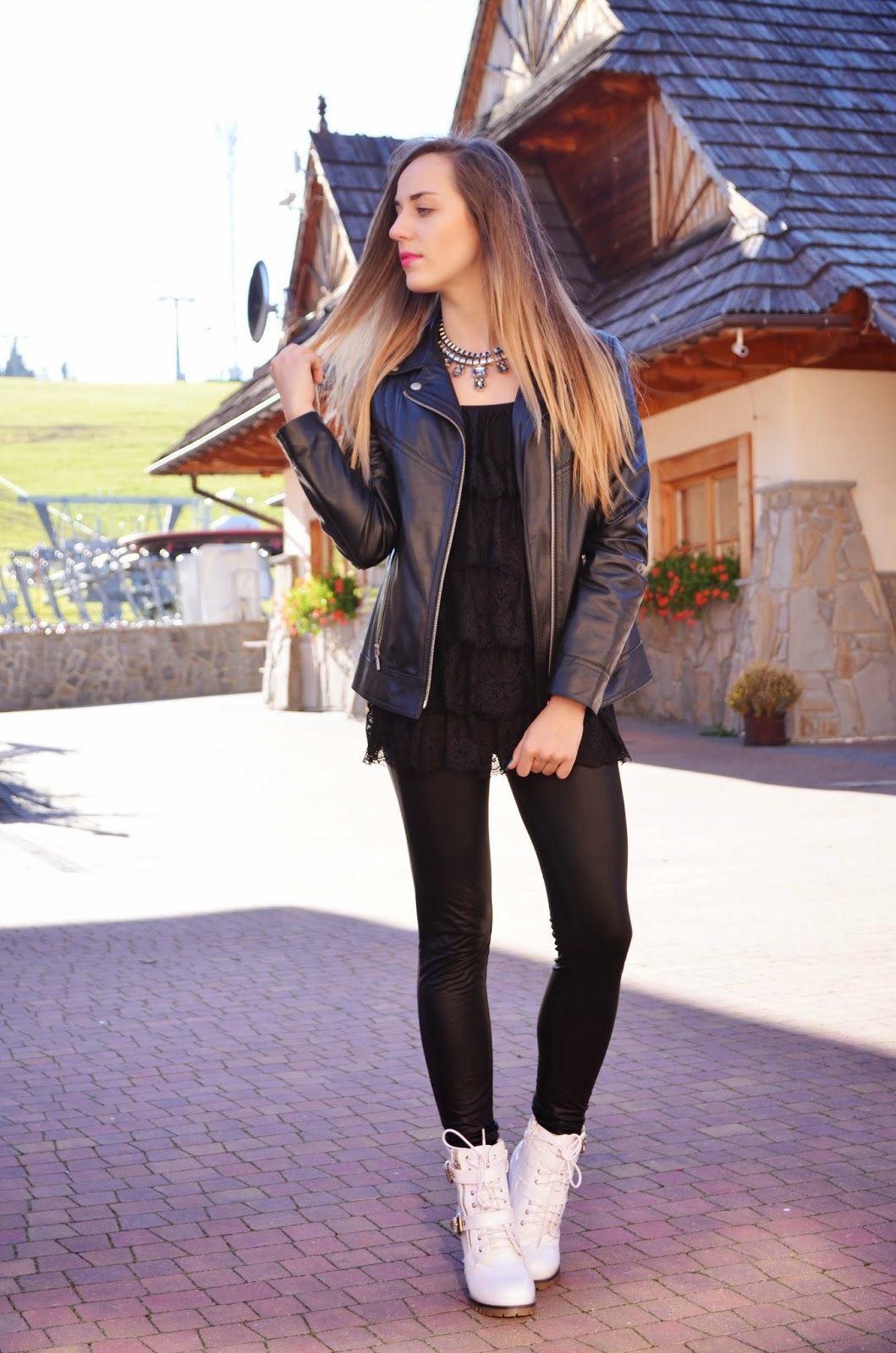 Zobacz oryginał pon., 29/09/2014 - 18:00Witajcie!:) Przychodzę dzisiaj do was prawie cała na czarno, prawie bo zamiast czarnych butów wybrałam białe:) Biel z czernią wygląda dobrze w każdym wydaniu. Botki są cudowne i pasują do wielu rzeczy w mojej szafie. Dodatkowo uwielbiam buty na grubym słupku, te są wygodne i stabilne. Akcentem są tutaj usta w kolorze fuksji, a wzrok przyciąga również naszyjnik, który fajnie wygląda w połączeniu z ramoneską i koronkową tuniką. Dodam, że kurtka jest mojego projektu, wymyśliłam ją już jakiś czas temu:)