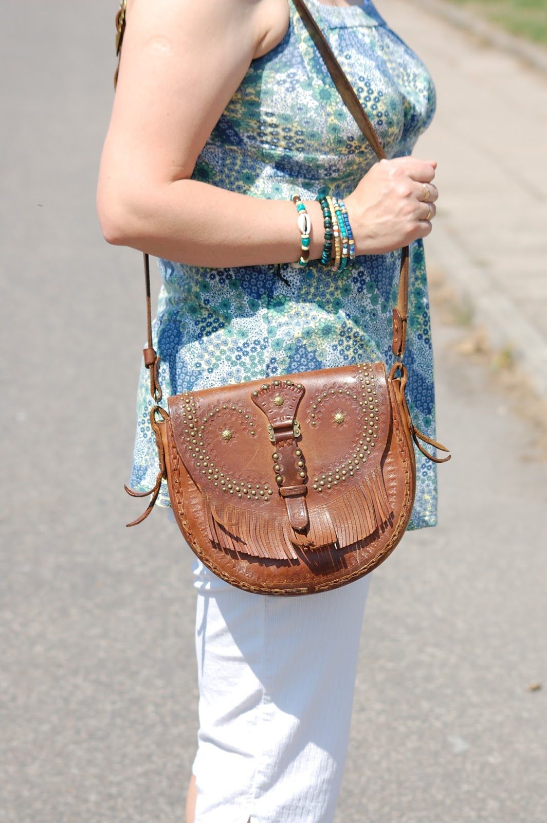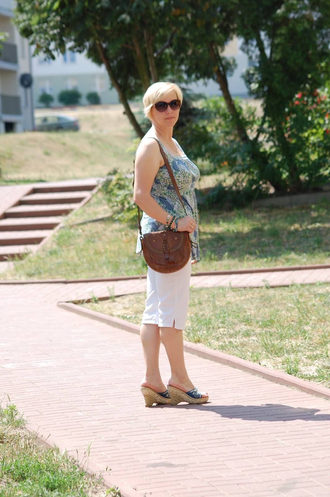 Bluzka w kwiaty a raczej kwiatuszki to jedna część dzisiejszego zestawu. Wykonana jest z oddychającej bawełny, na szerokich ramiączkach, lekko marszczona pod biustem, rozszerzana ku dołowi. Idealny fason na upalne dni. Założyłam do niej białe spodnie za kolano, ale byłyby też dobre krótkie szorty. Kolor biały zawsze się sprawdza latem. Zauważyłam, że białe zestawy albo prawie białe są teraz na topie. Zresztą, gdyby się tak zastanowić, to co nie jest na topie? Z dodatków torebka z dawnych lat, taka trochę hippi, bransoletki i dżinsowo - cekinowe klapki na sznurkowych koturnach. I jeszcze kocie okulary, na które dawno miałam ochotę. Oto cały mój zestaw. Miłego oglądania.