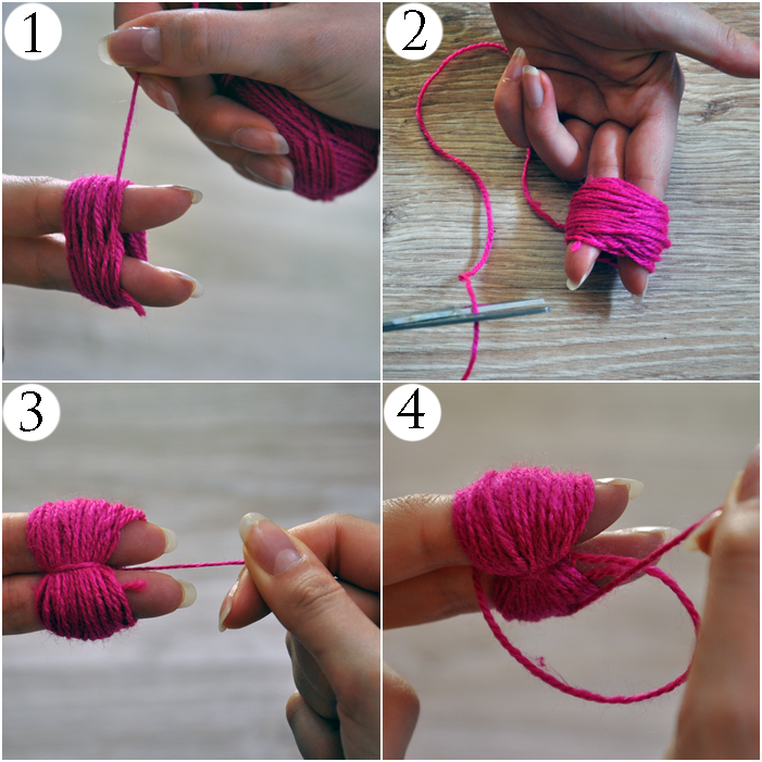 1. Nawijam włóczkę na 2 lub 3 palce. Zależało mi na małych, delikatnych pomponach, więc dwa w zupełności wystarczyły. Zostawiam małą przestrzeń między palcami, aby później łatwiej mi było przeplatać koniec włóczki.