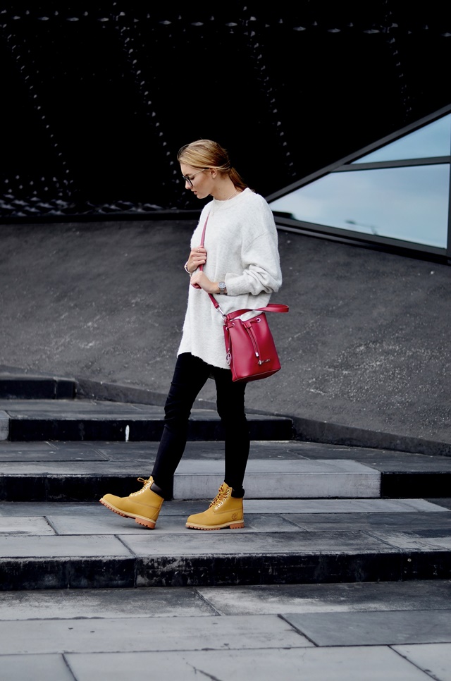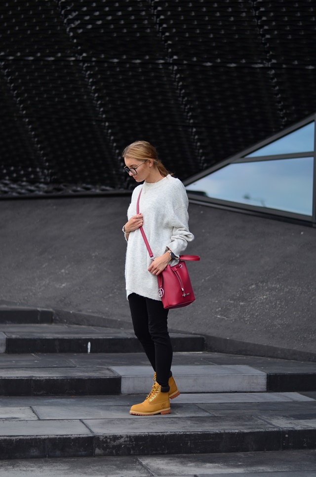 Buty- kultowe Timberlandy, które od lat są synonimem trwałości i solidności. Ja posiadam je w tradycyjnym, miodowym odcieniu i czarnym (bardziej delikatniejszy model). Są ponadczasowe, noszone niezmiennie z pokolenia na pokolenie. Udawadniają, że obuwie może być wygodne i stylowe. Nic tak nie zachęca do wyjścia na spacer- do miasta czy do parku w modnym ubraniu i... modnych butach!