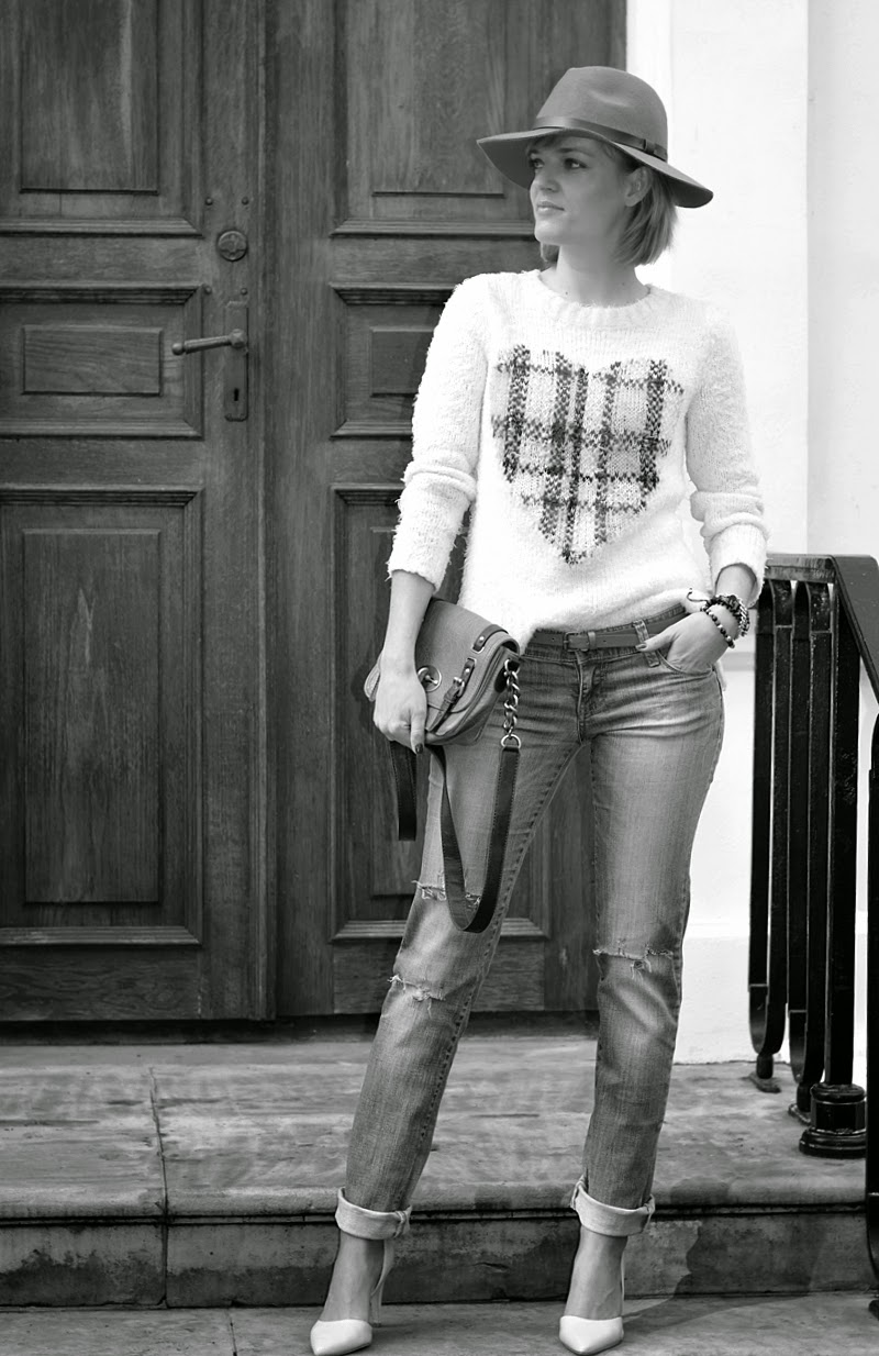 Dzisiejszy look pod znakiem boyfriendów :-) Nie jest to może najpiękniejszy typ spodni, bo z założenia nie są dopasowane do sylwetki, mają wyglądać na znoszone i do tego najlepiej jak są przetarte i podziurawione :-) Moje to i tak ich łagodniejsza wersja :-) Ale po dodaniu kilku ładniejszych i kobiecych elementów całość nabiera innego charakteru. A szpilki to w tym wypadku absolutna konieczność :-)