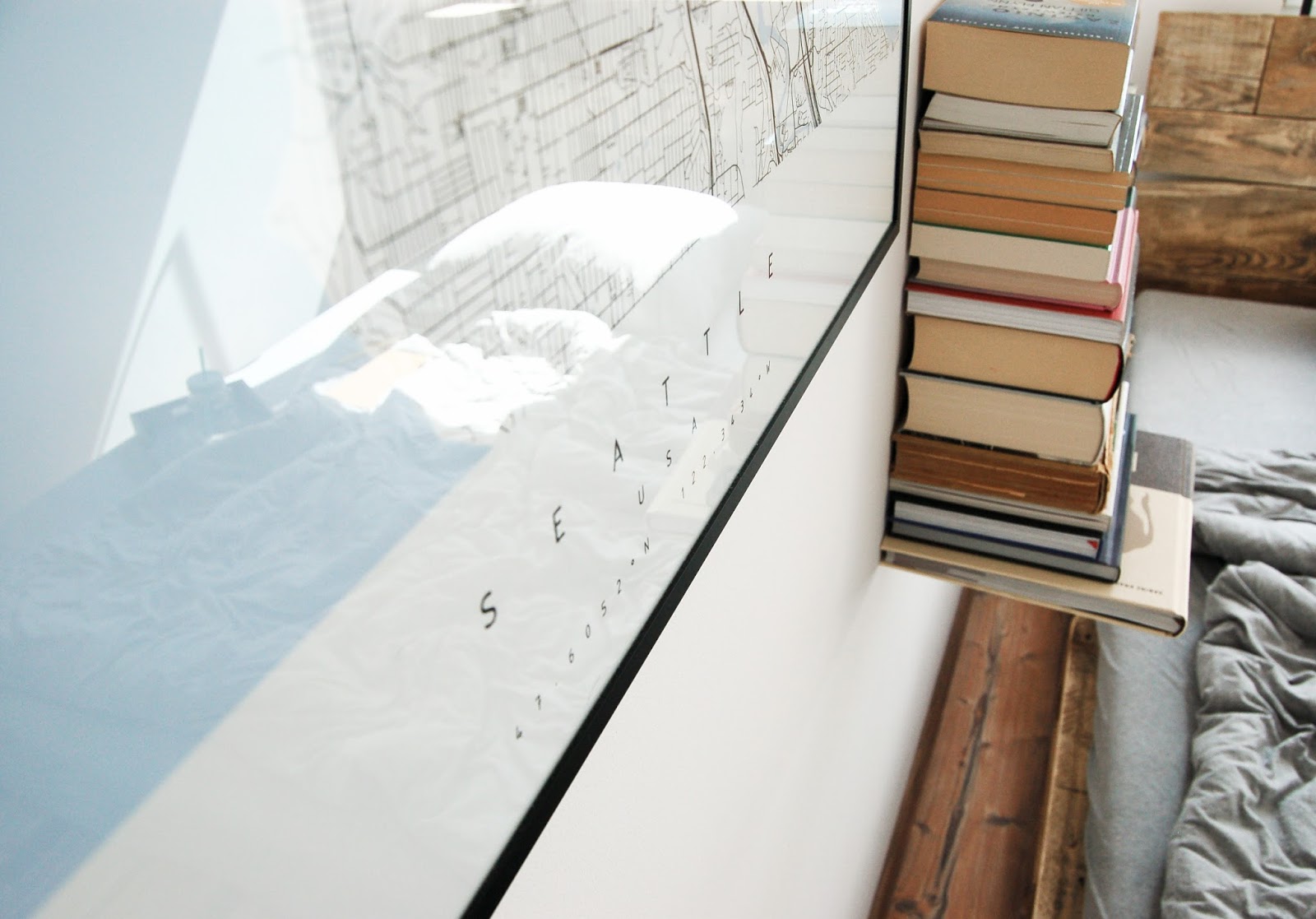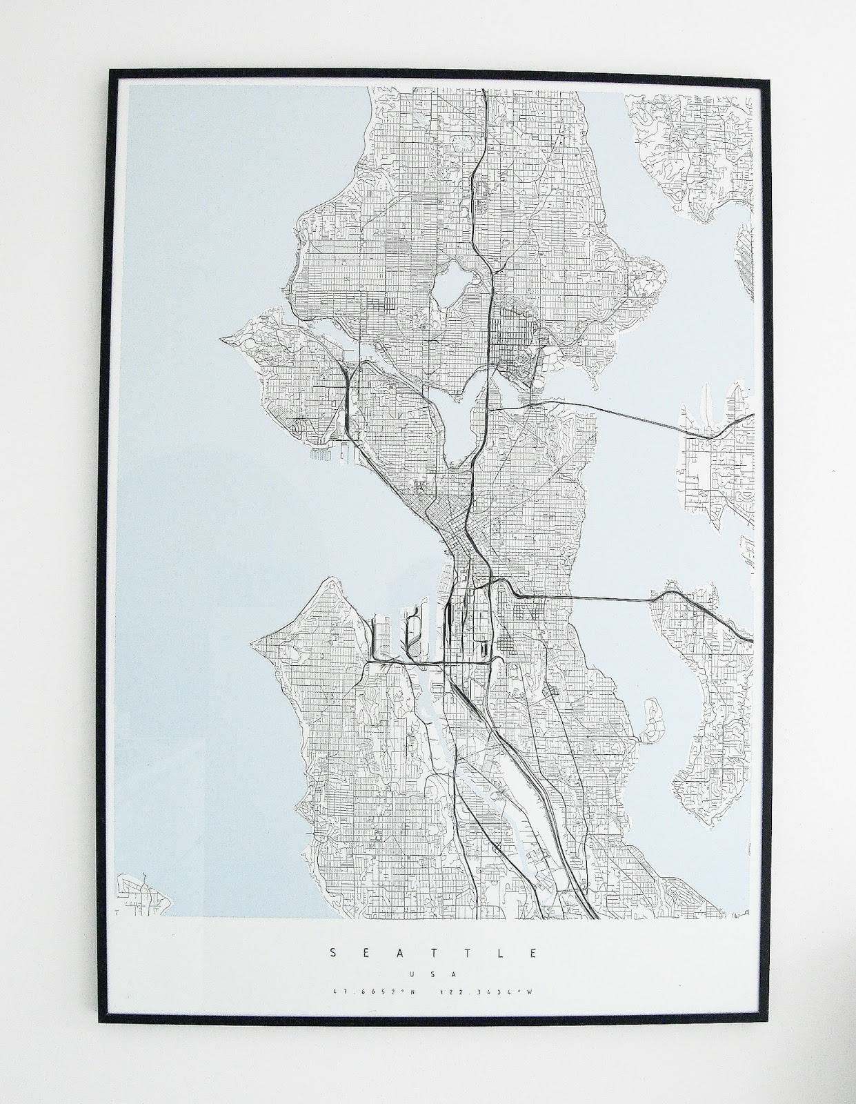 Poza półkami zdecydowałam się na umieszczenie w sypialni mapy Seattle w szklanej ramie od Maptu. Jest duża, bo aż 70 cm x 100 cm. Bardzo mi się podoba, a niebieski kolor wody rewelacyjnie ożywia ścianę. Mapa to dobra alternatywa dla grafik z napisami, zdjęć i innych obrazów. Można wybrać ulubione miejsce, które z jakiegoś względu jest dla Was ważne, do którego chcecie pojechać, zwiedzić, zamieszkać. Moim zdaniem świetna sprawa.