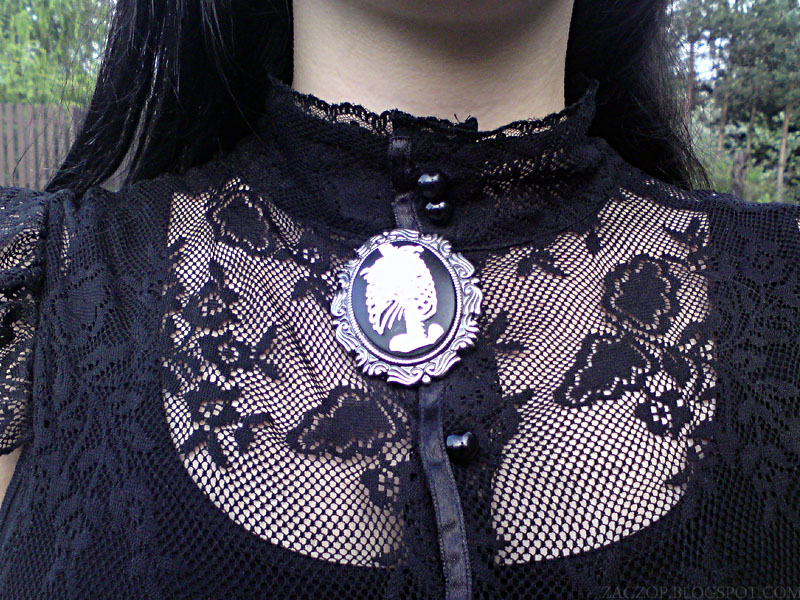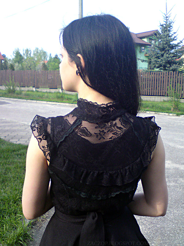 Koronkową bluzeczkę wyszperałam kiedyś w lumpeksie. Nie nosiłam jej za często, uważając, że źle na mnie leży, ale chyba jednak zaczynam się do niej przekonywać. Ma przeurocze koronkowe detale na plecach.