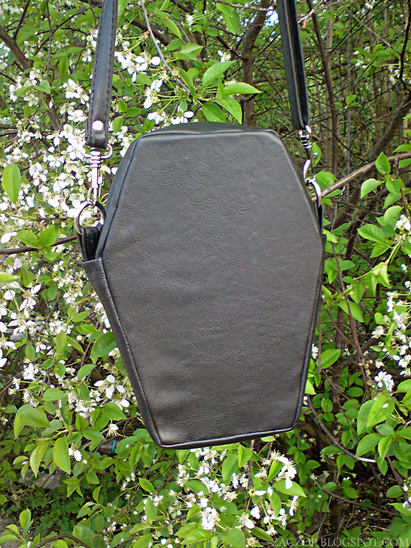 Trumienka od dawna była moim skrytym marzeniem, a dzięki blogowi Madam Mari Mortem odkryłam fakt, który powienien dla mnie być oczywisty - mianowicie, iż zamiast narzekać, że markowe trumny są dla mnie zbyt drogie, mogę sama sobie zrobić podobną. Torebka nie jest jeszcze skończona - brakuje jej ozdób, a podszewka nie jest jeszcze przymocowana tak jak powinna, niemniej jednak nie mogłam oprzeć się pokusie zabrania jej ze sobą.