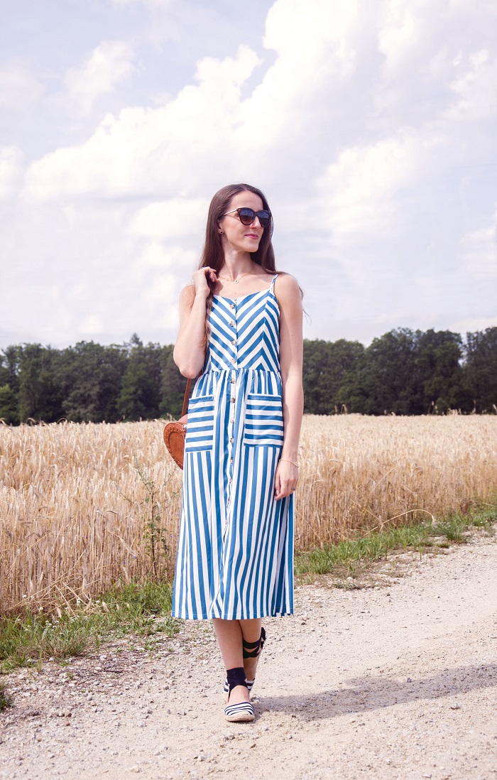 Nie mogło oczywiście obejść się bez wygodnej i przewiewnej stylizacji. Letnia sukienka z guzikami na froncie oraz kieszonkami, mała okrągła torebka i wiązane espadryle świetnie pasują do bardzo wakacyjnego stylu boho. I świetnie wpisują się w klimat dzisiejszych zdjęć. Sporo też w mojej tegorocznej garderobie długości midi - czuję się w nich swobodnie i wygodnie, a jednocześnie bardzo kobieco. Póki co nie odpuszczam temu fasonowi.