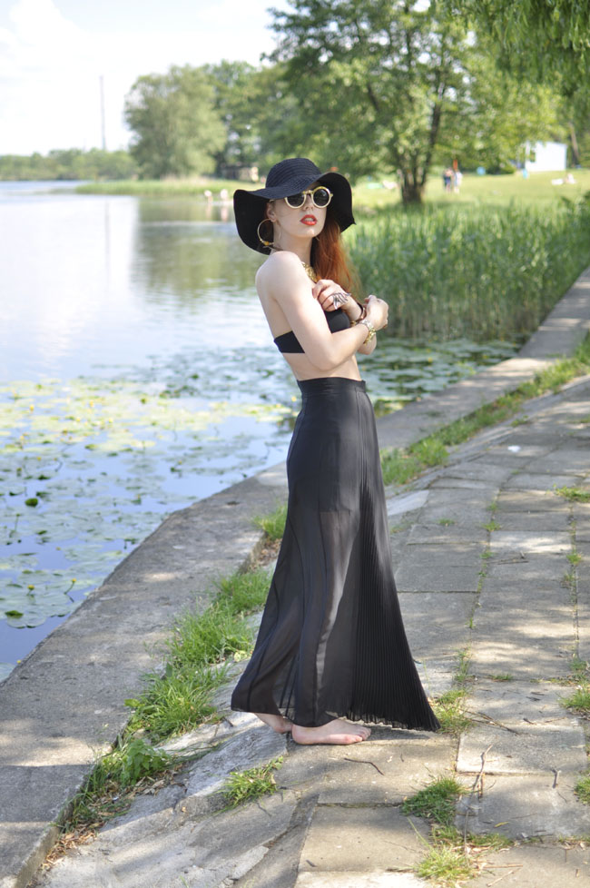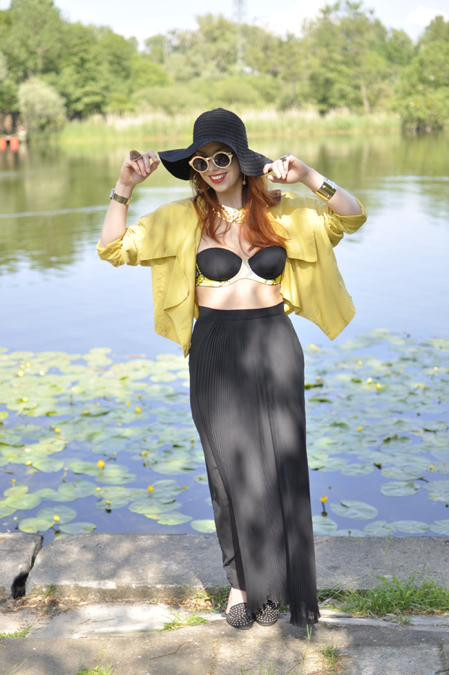 Jak doskonale wiecie, nie przepadam za czernią i niezbyt wiele, poza dodatkami, mam z nią do czynienia. W mojej szafie gości jednak pewna Pani spódnica, osamotniona bardzo, właśnie w tym kolorze. Nie wychyla się ona z szafy owej przez 3/4 roku, aby latem(!) zupełnie nie dać się prosić i wypełznąć na salony. Nie pasuje do niej bowiem żaden gruby sweter, płaszcz jesienny, ani tym bardziej odzienie wierzchnie uposażone w puch, zwane dalej kurtką zimową, a jedynie zwiewne podfruwajki lub zwyczajnie krótki top. I ta Pani vel Czarna Dama, nie znosi towarzystwa w innym kolorze.. W zeszłym roku przemyciłam trochę srebra, ale w tym, ze względu głównie na żółty szał, dobrałam nieco tej barwy. Raczcie się więc..