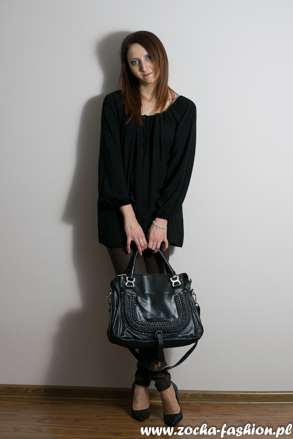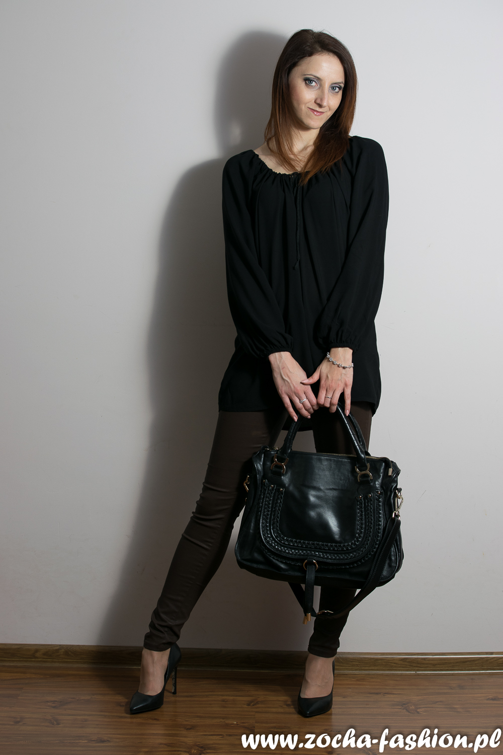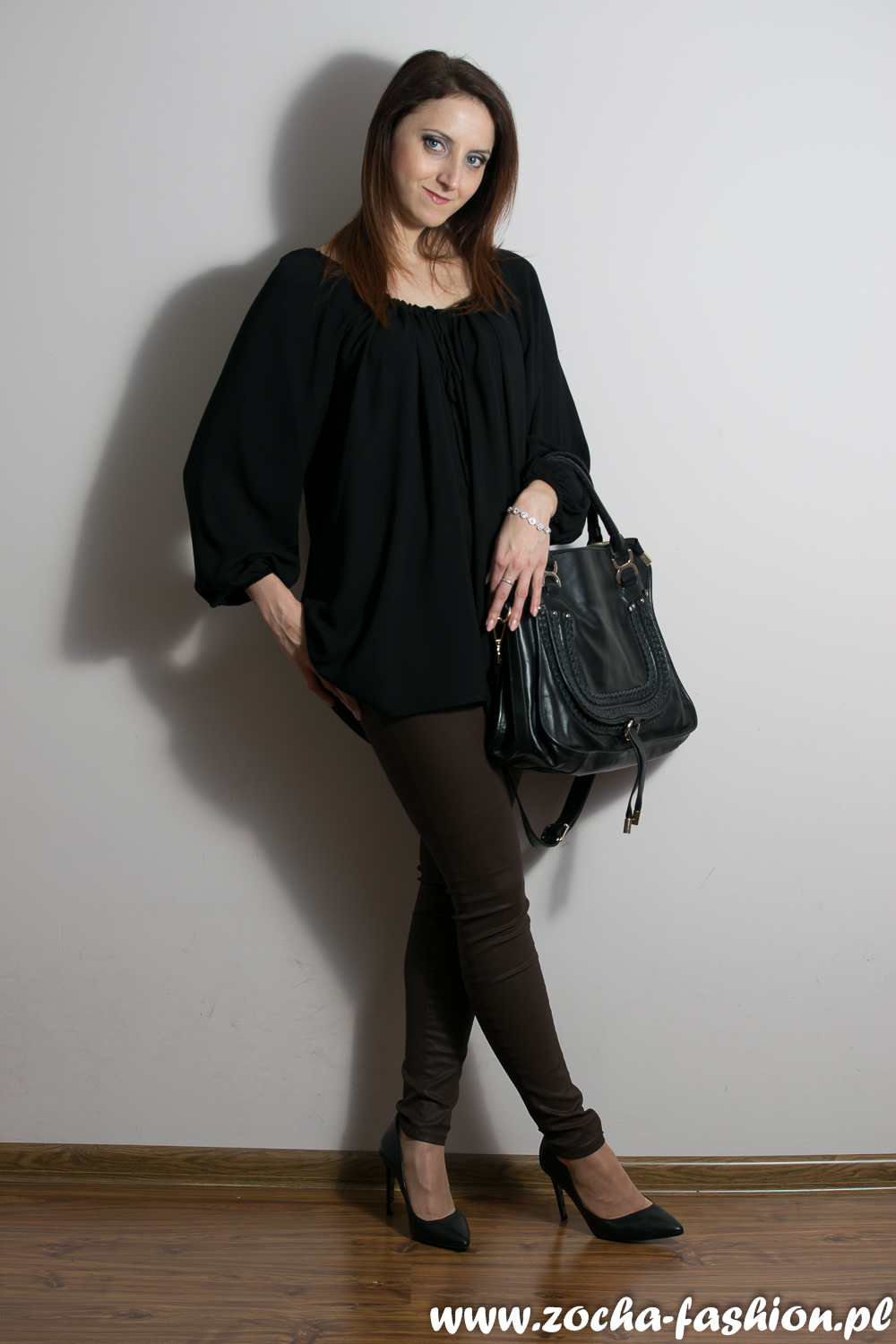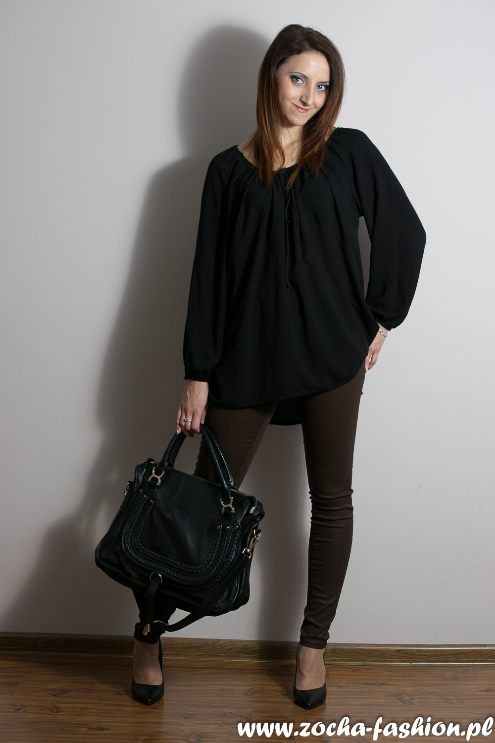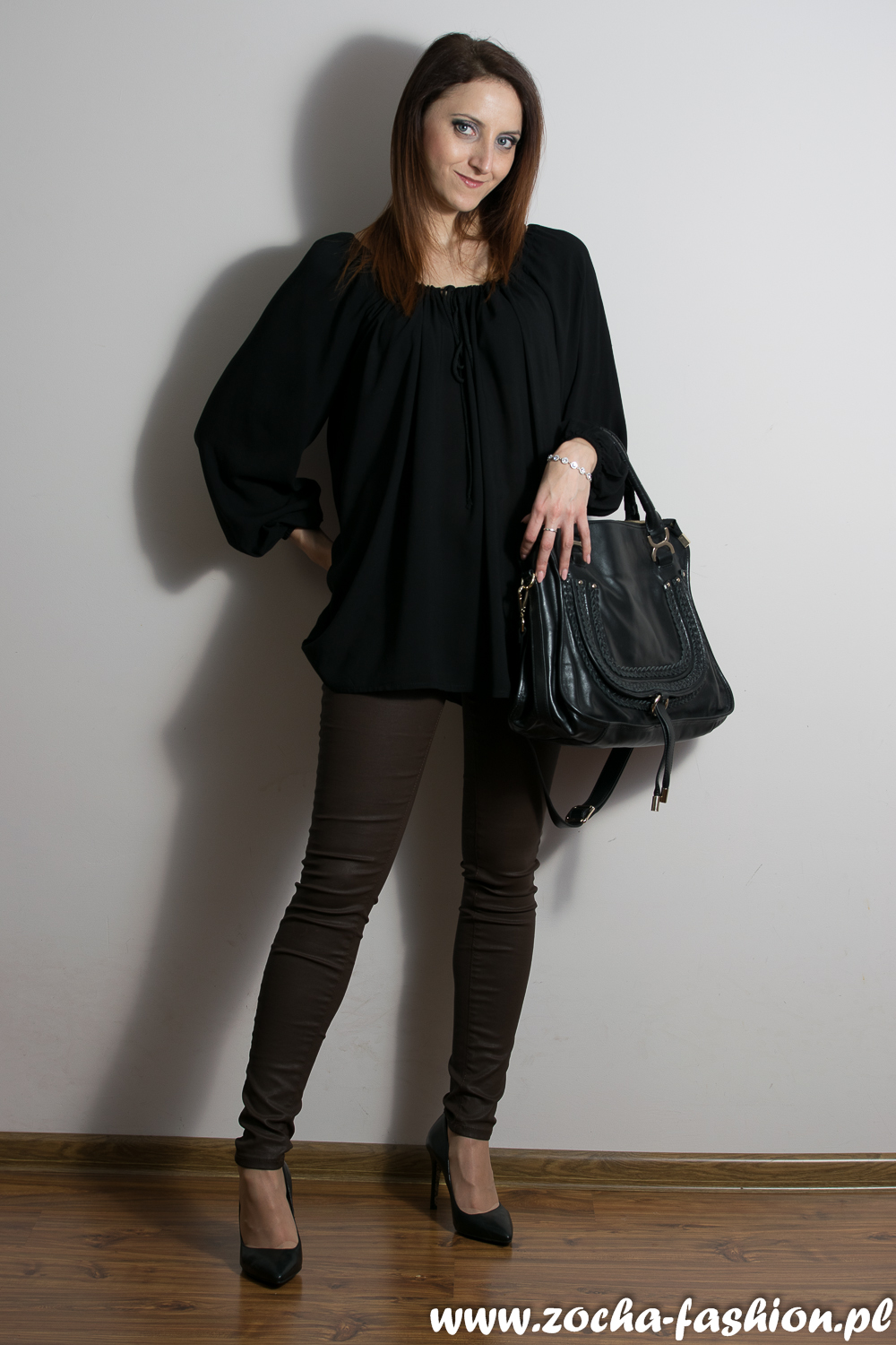 Dzisiejszy mój zestaw to delikatna, zwiewna bluzka, trochę w stylu Boho. Świetnie się również spełni jako tunika. Dół to woskowane rurki w odcieniu ciemnej czekolady. Dodatki w postaci klasycznych czółenek oraz nietuzinkowej torby w tym samym kolorze świetnie uzupełniają całość. Aby stylizacja miała charakter bardziej elegancki, zastosowałam komplet biżuterii z kamieniami swarovski. Ciekawa jestem czy ten zestaw przypadnie Wam do gustu. Czekam na opinie :)