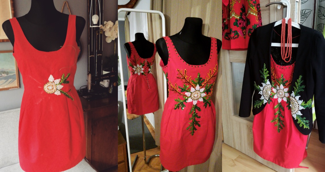 Czerwona, stylizowana, góralska sukienka z odpinaną spódnicą, ręcznie wyszywana cekinami i koralikami.