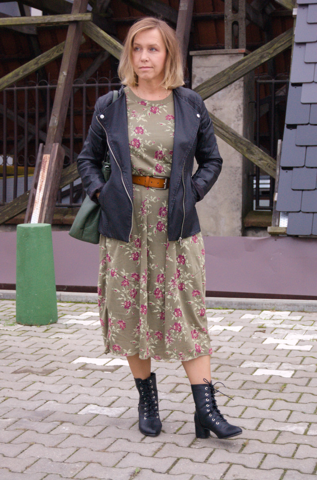 Sukienka, botki-Bonprix, ramoneska-Lidl, torebka, pasek-Butik, długie kolczyki liście-Allegro.
