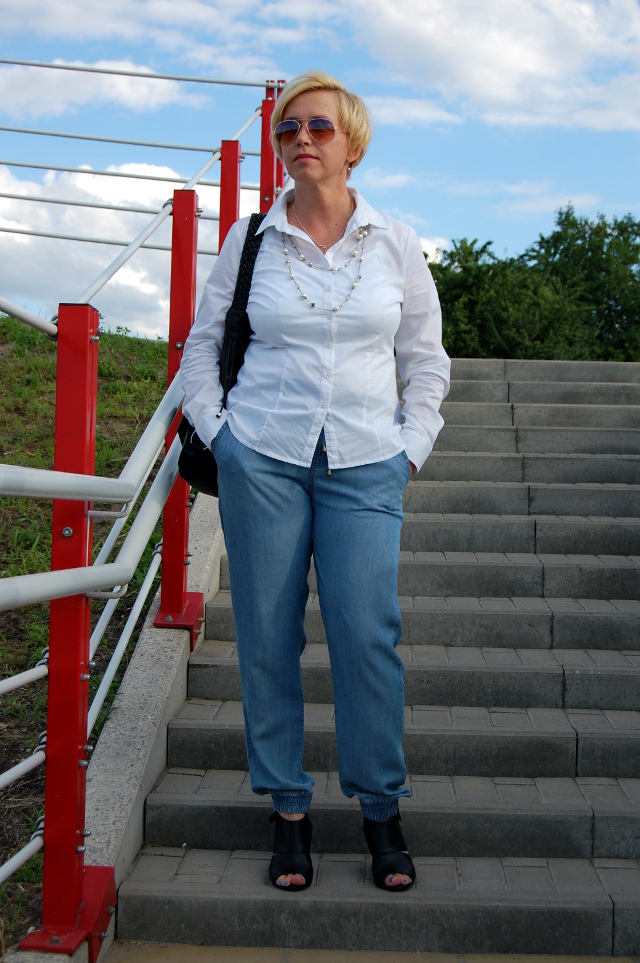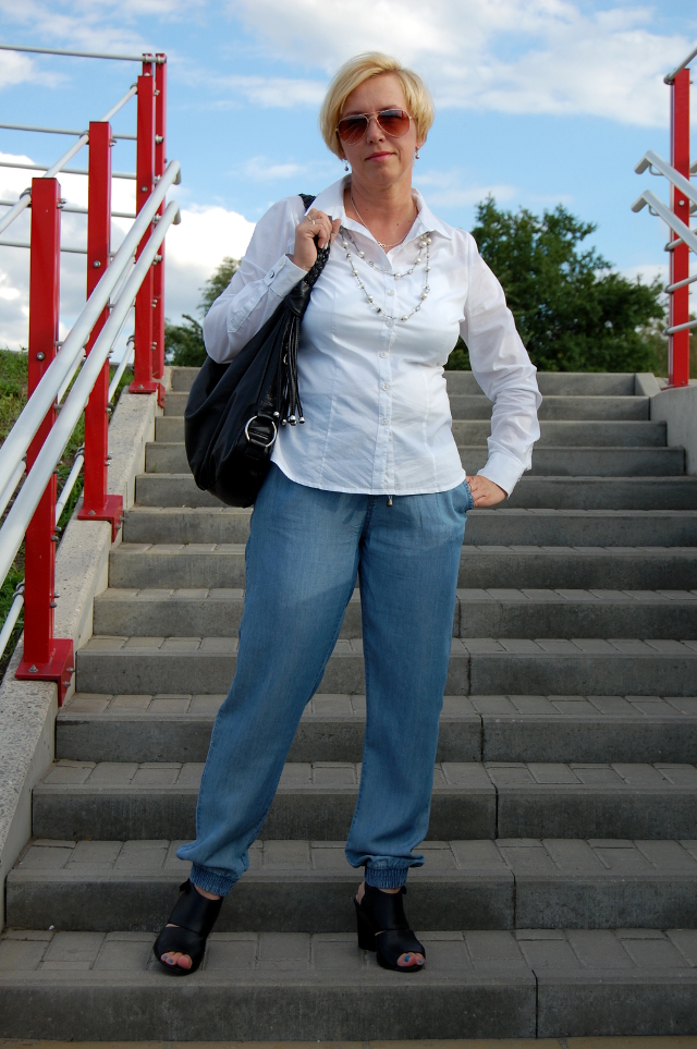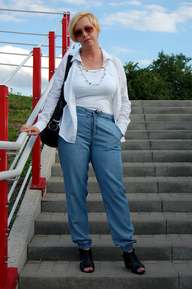 Tym razem założyłam do spodni koszulkę na ramiączkach i białą koszulę. Dodałam perłowy naszyjnik albo raczej korale to są, które znalazłam w ciuchu. Podobne widziałam kiedyś w Rossmannie i w Tesco na dziale F&F, z tym, że sześć razy droższe. Ja za swoje dałam pięć zł. i muszę zaznaczyć, że są solidnie wykonane. Także czasem warto zajrzeć do ciucha.