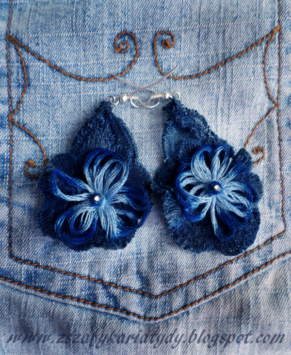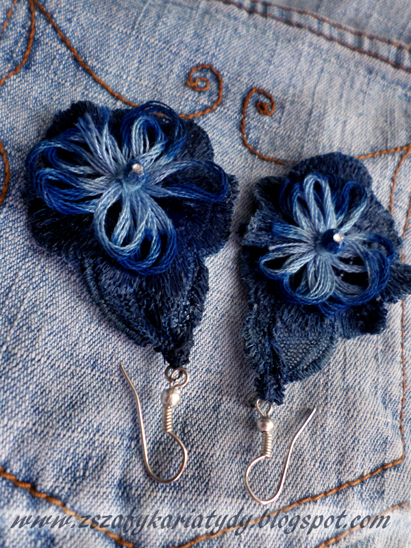 Ponieważ jestem w trakcie przygotowywania dla Was mojej kolejnej stylizacji, tym razem wczesno jesiennej. Uchylę rąbka tajemnicy: będzie kwiat na torebce, na butach, no i oczywiście, że będzie jeans. Czego mi zabrakło do całości stylizacyjnej kompozycji? Od razu pomyślałam o takich kolczykach, które dziś możecie ocenić. Jak zwykle szukanie wymyślonego wcześniej akcentu w sklepach czasem zajmuje wiecej czasu, niż zrobienie go samemu. Tak właśnie urodził się w mojej głowie “denimkowy” projekt kolczyków. Ponieważ przygotowałam je już jakiś czas temu, muszę powiedzieć...nie unikajcie dużych kolorowych kwiatów w biżuterii. Są świetne zwłaszcza jako kolczyki, efektowne broszki oraz wisiory. Letnie i wiosenne zestawy ubrań, aż się proszą o taki dodatek. Całe lato nosiłam je w różnych kombinacjach. Bo kwiat pasuje do wzorzystej kwiecistej sukienki, tuniki oraz t-shirt’a. Moje kwiatowe ozdobniki ponieważ są granatowo niebieskie pasują również idealnie do jeansu. Denimkowe kolczyki przydadzą mi się jeszcze nie raz.